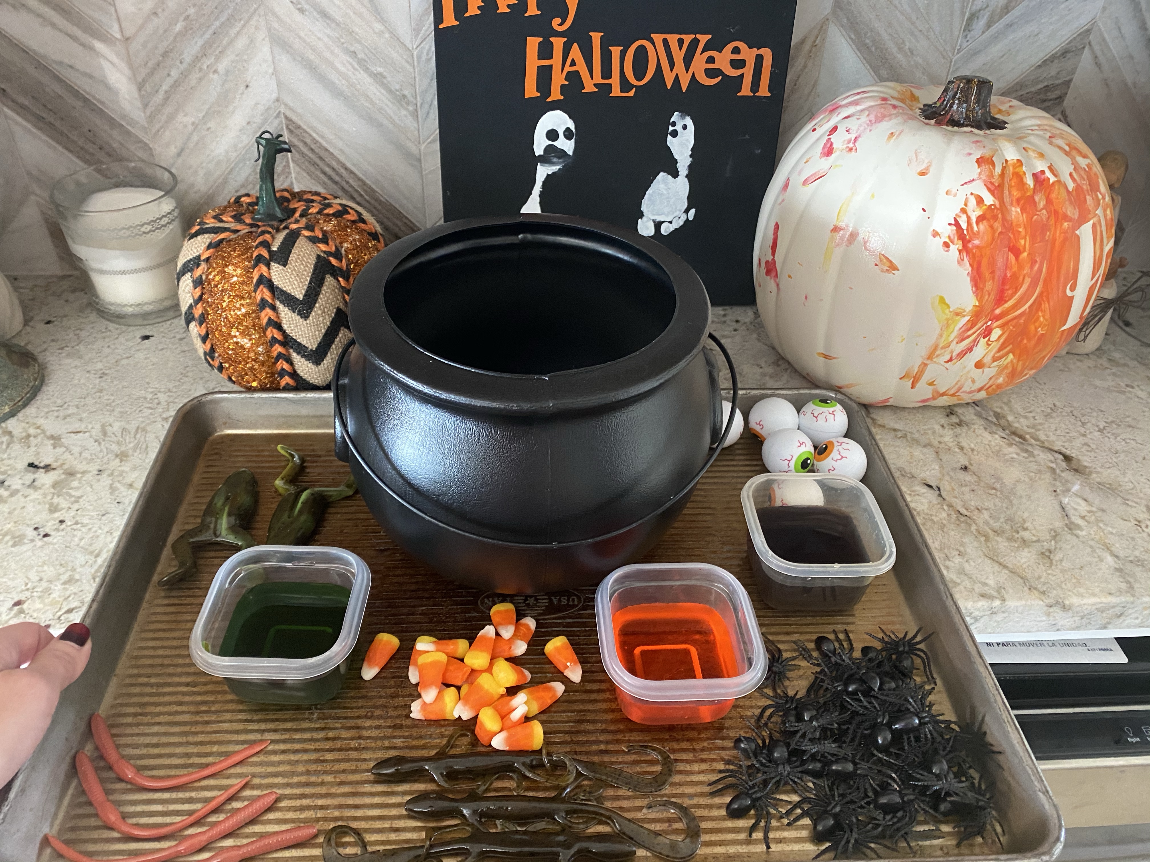 –Witches brew sensory play: This was a huge hit- my kids both played with it for about an hour! I filled our cauldron with about a cup of baking soda, then gave them a pan with fake eyeballs, spiders, worms, lizards, frogs, candy corn, and a few containers of vinegar dyed Halloween colors with food coloring. They had a blast throwing in all the spooky ingredients and watching the vinegar make the potion fizz. Then they added some water and just scooped and poured and played with all the gooey ingredients the rest of the time! A towel under the cauldron is a MUST to collect spills! LoL I got the inspiration from Pocket of Preschool then just ran with it regarding ingredients (my husband has a bunch of fishing lures, so they made great gooey additions to our brew!)