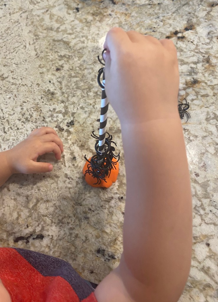 –Spider ring threading: Both my littles jumped in on this fun fine motor activity! You just poke a straw in a lump of playdough, give your little a pile of spider rings (we got ours at Walmart with our grocery order), and have your little thread the spiders onto the straw. I had to show my youngest how to do it first, but he got the hang of it fairly quickly! If your little still puts things in their mouth, make sure to keep a close eye on them with this activity- mine is pretty good, but I still sat him on my lap as he worked just in case he decided to taste a spider!