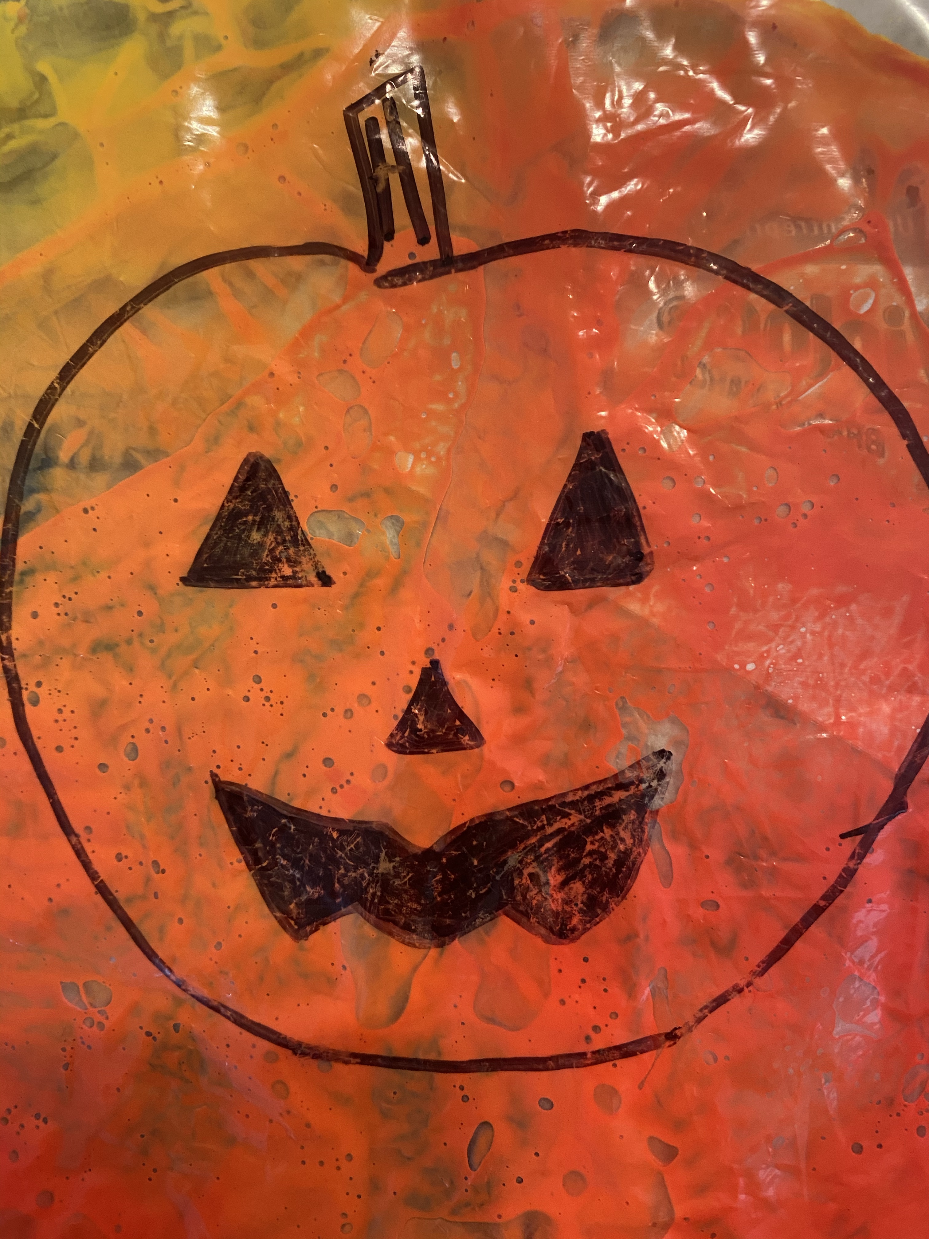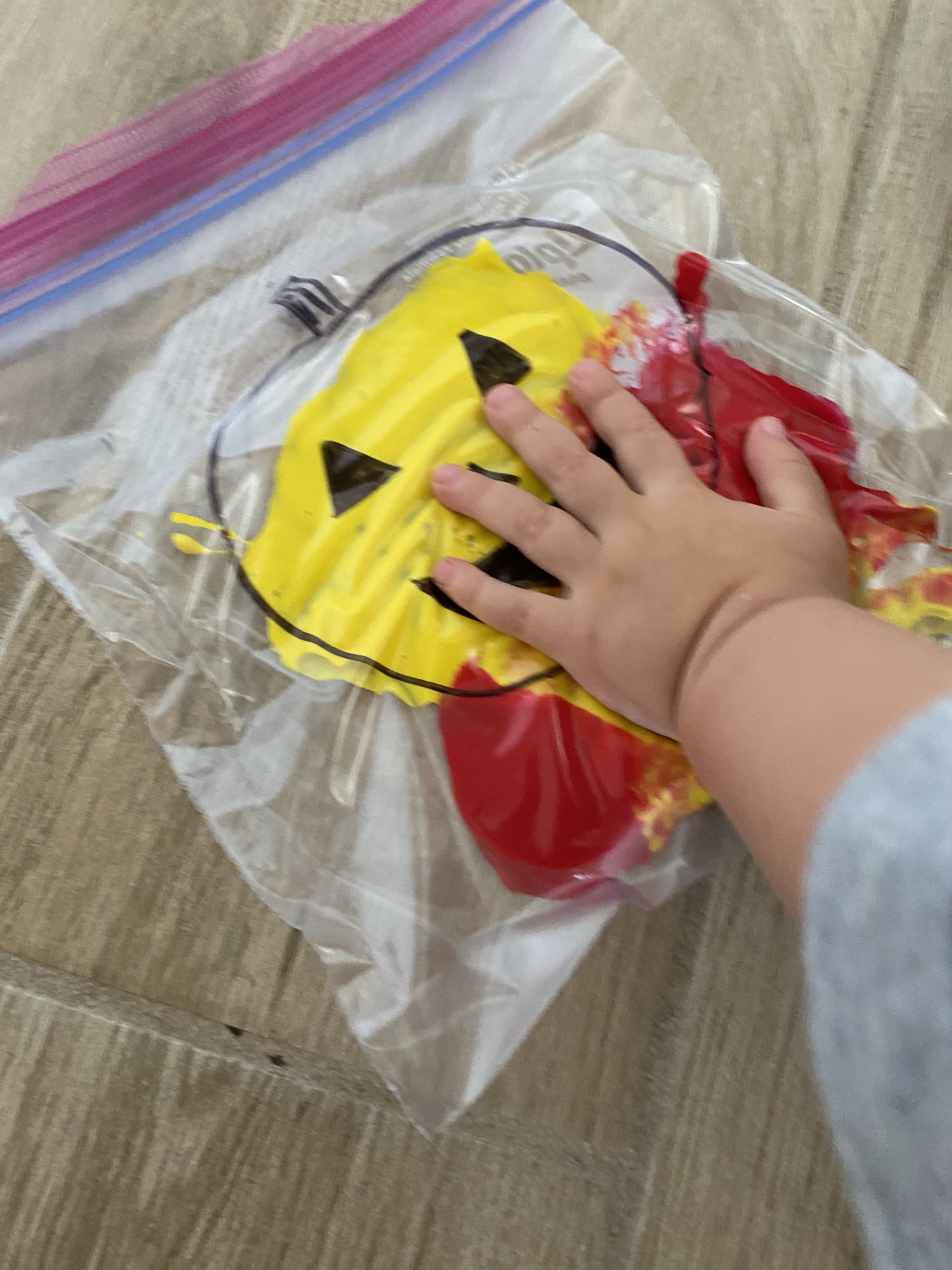 –Pumpkin color mixing: I drew a jack-o-lantern face on a Ziplock bag then threw in some red and yellow paint. My little squished the paint around until it was well mixed and his pumpkin was orange! It was a little tricky to mix the paint though- I think if you also throw in some shaving cream it would make it easier, especially if your little is closer to 1.