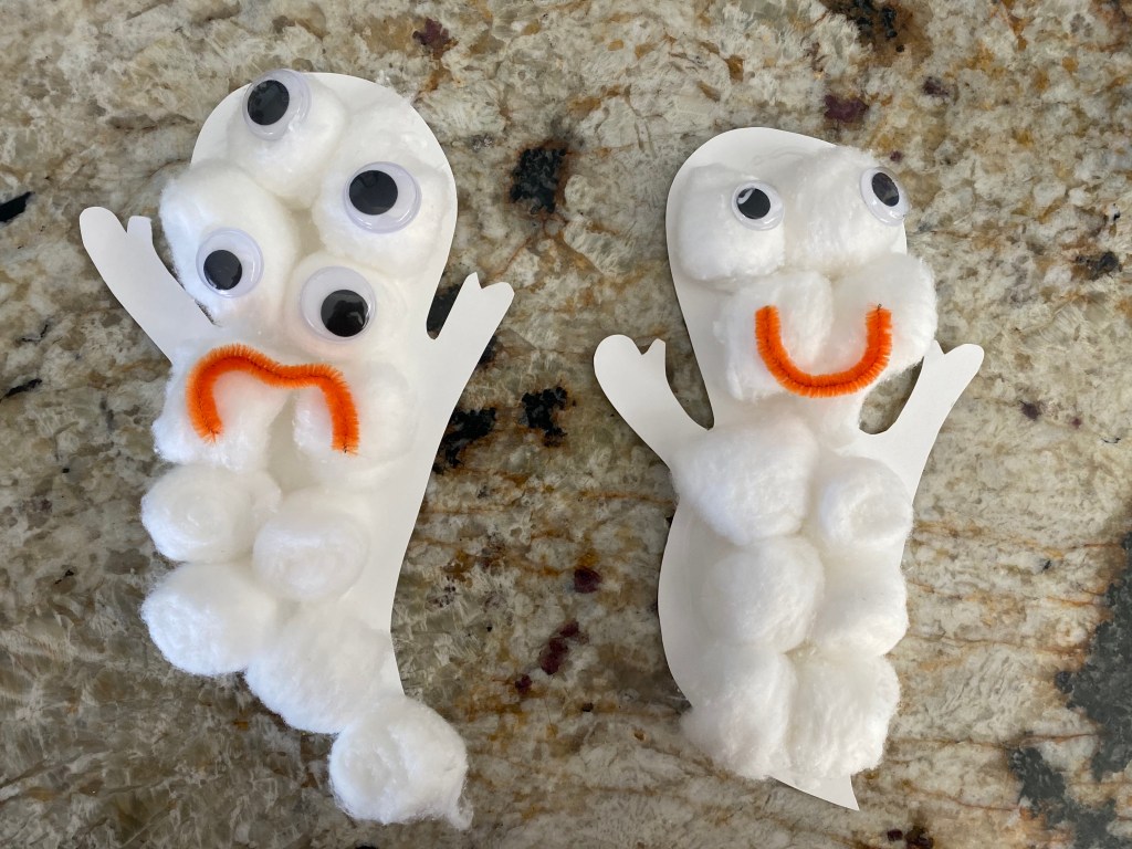 –Puffy ghosts: I cut out ghost shapes from cardstock, put some glue on the head and body, then had my little cover the ghost with cotton balls. Then he chose two googly eyes and I helped him glue them on. We added a pipe cleaner for a mouth and voila! Puffy ghost! (My preschooler made one too- he just did it without help…hence the 4 eyeballs hahaha!) I got this idea from Thriving Home Blog.