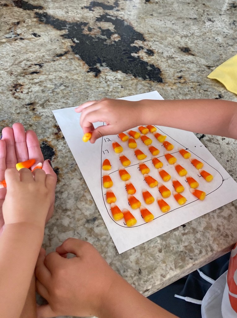 -Candy corn roll and uncover: I drew a large candy corn on a sheet of paper then wrote the numbers 1-50 inside it. Then I covered the numbers with candy corn, and had my little roll a 10 sided dice, identify the number and then count and uncover the digits for that many corns. Then we’d count how many we’d uncovered so far as I pointed to each corresponding digit until all 50 were uncovered. (for example: if he’d already uncovered 6, and he rolled a 4, he would take 4 candy corns off the next 4 numbers, then we’d count all the numbers that had been uncovered so far…1-10). I got the idea from Teachers Pay Teachers, but just made my own worksheet! If you follow the link, you can get a whole set of candy corn math activities for just $1!