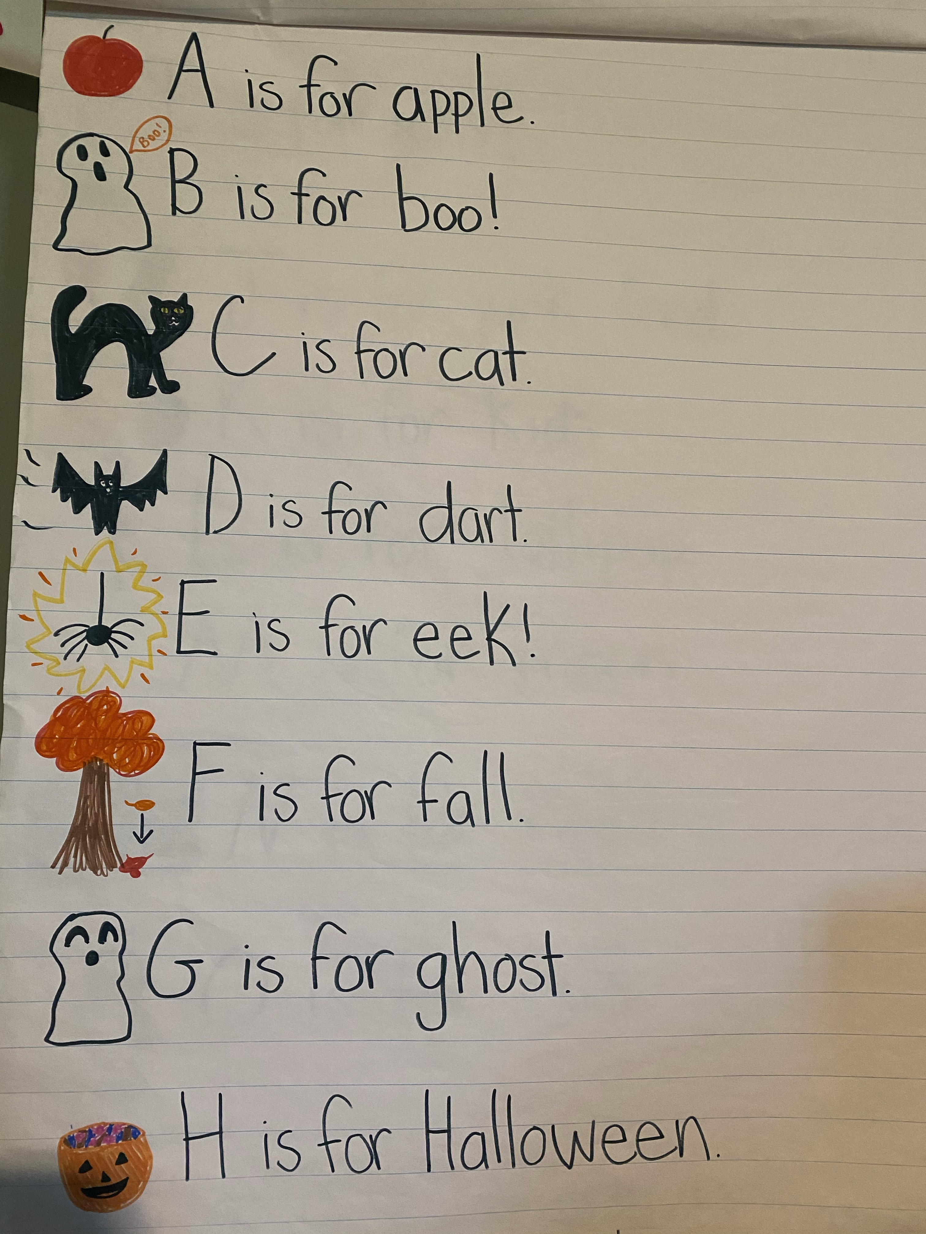 -Halloween ABC’s: We actually made this list last year, so I pulled it out of the closet and added it to our daily calendar time (for more calendar ideas, check out my blog post Preschool Calendar Time). Each day, we read the list while pointing to each letter/word.
