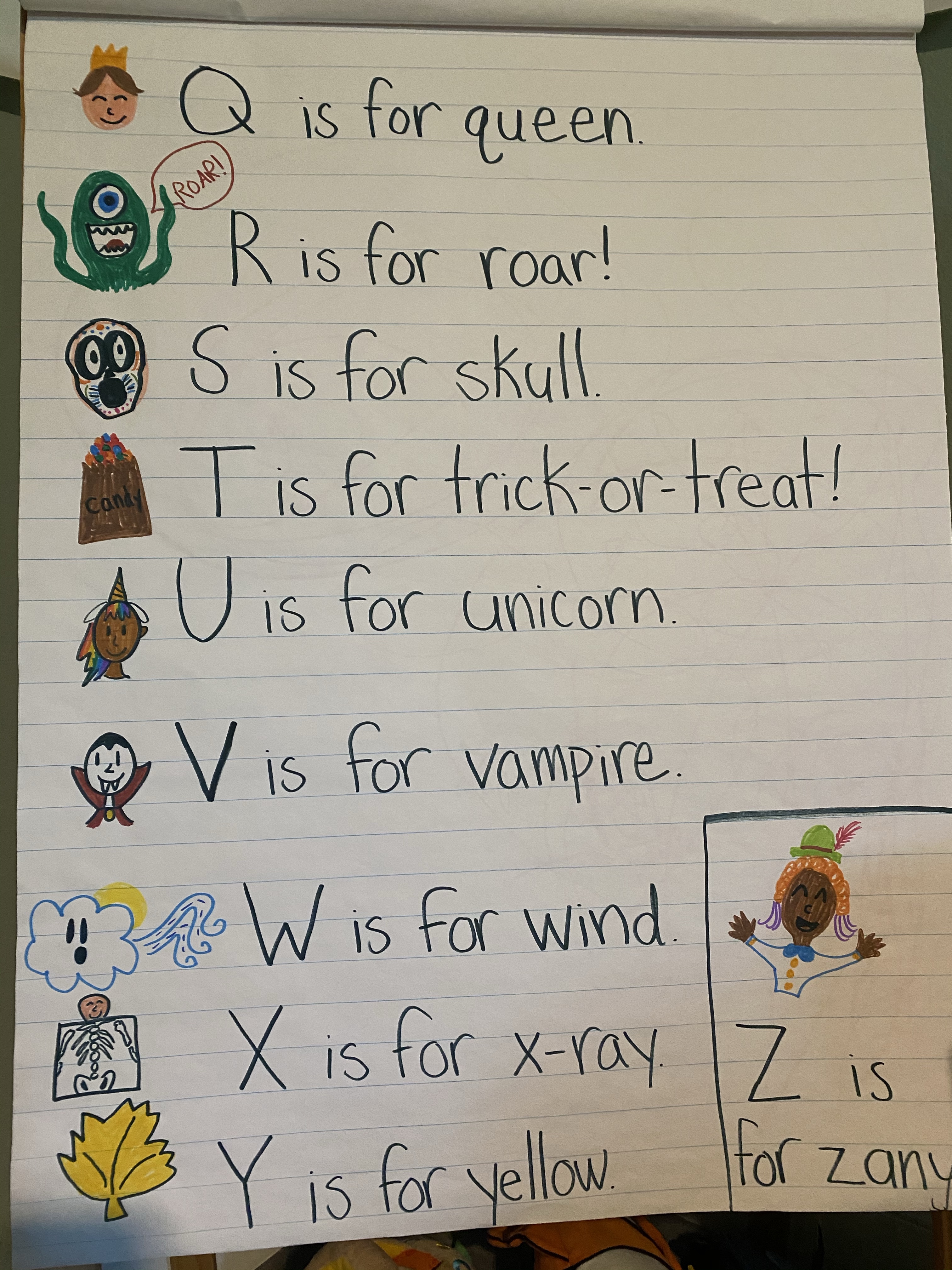 -V is for vampire, Z is for zombie: I made two handwriting practice pages by making V’s and Z’s with dots, then had my little trace the letters in pencil. If you want to make this reusable, just tuck the pages in a page protector and have your little write with a dry erase marker!