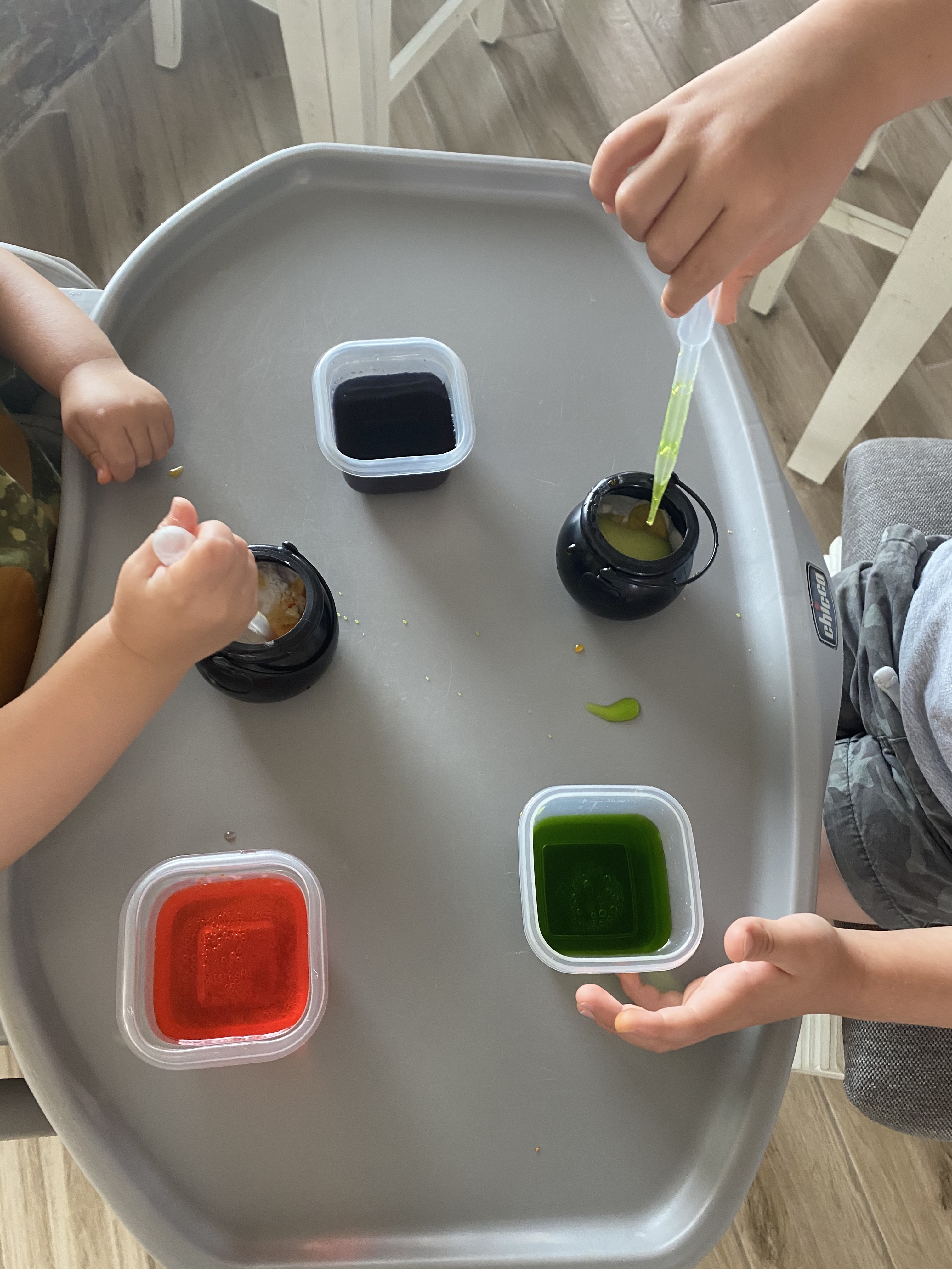 -Fizzy cauldrons: I think every preschooler loves some fizzy science, so I poured some baking soda in a few mini cauldrons we had, gave my littles spoons and pipettes as well as Halloween colored vinegar and let them play and mix and explore!
