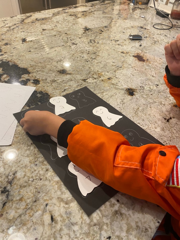 -Ghost number match: I made ten ghosts out of cardstock and traced them on black construction paper with a white colored pencil. I added numbers to each ghost so my little could match the cardstock ghosts to the ghosts on the page. We reviewed the number names together as we went (and also pretended he was a ghostbuster who had to catch and match each ghost to save the city! LoL). I got this idea from Toddler Approved.