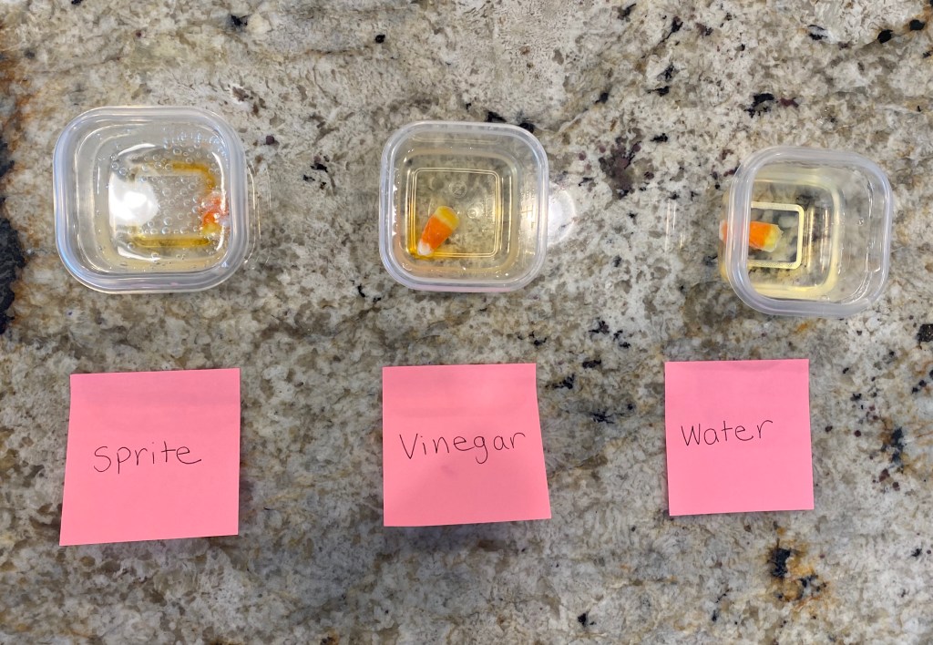 -Dissolving candy corns: We reviewed what makes something a liquid, then I had my little choose 3 liquids to dissolve candy corn in. Before we started I had him predict which one would work the best and why. Then we poured 1/4 cup of each liquid into some small tupperware cups, plunked in a candy corn and made observations as they dissolved! I got this idea from Teachers Pay Teachers.