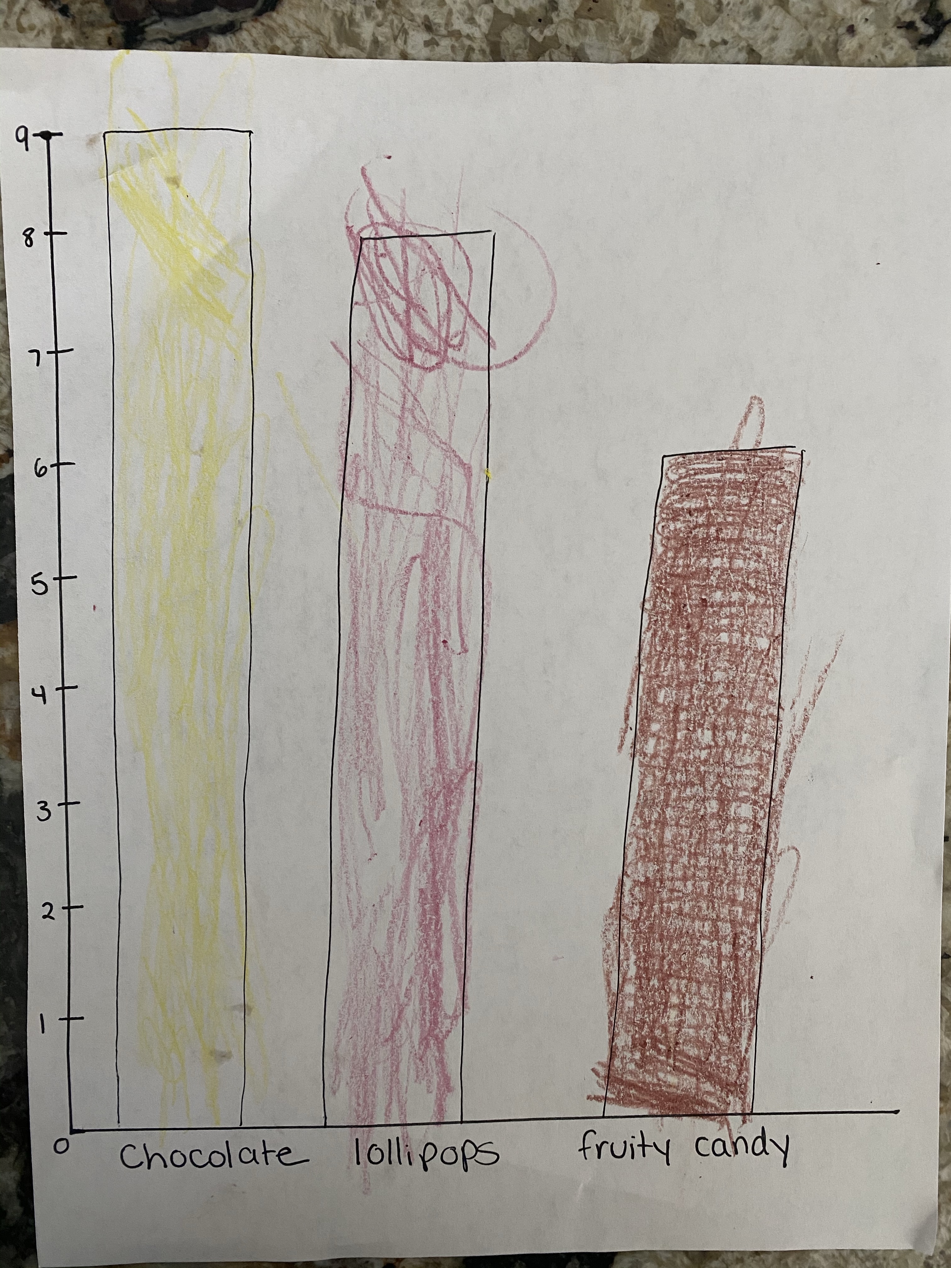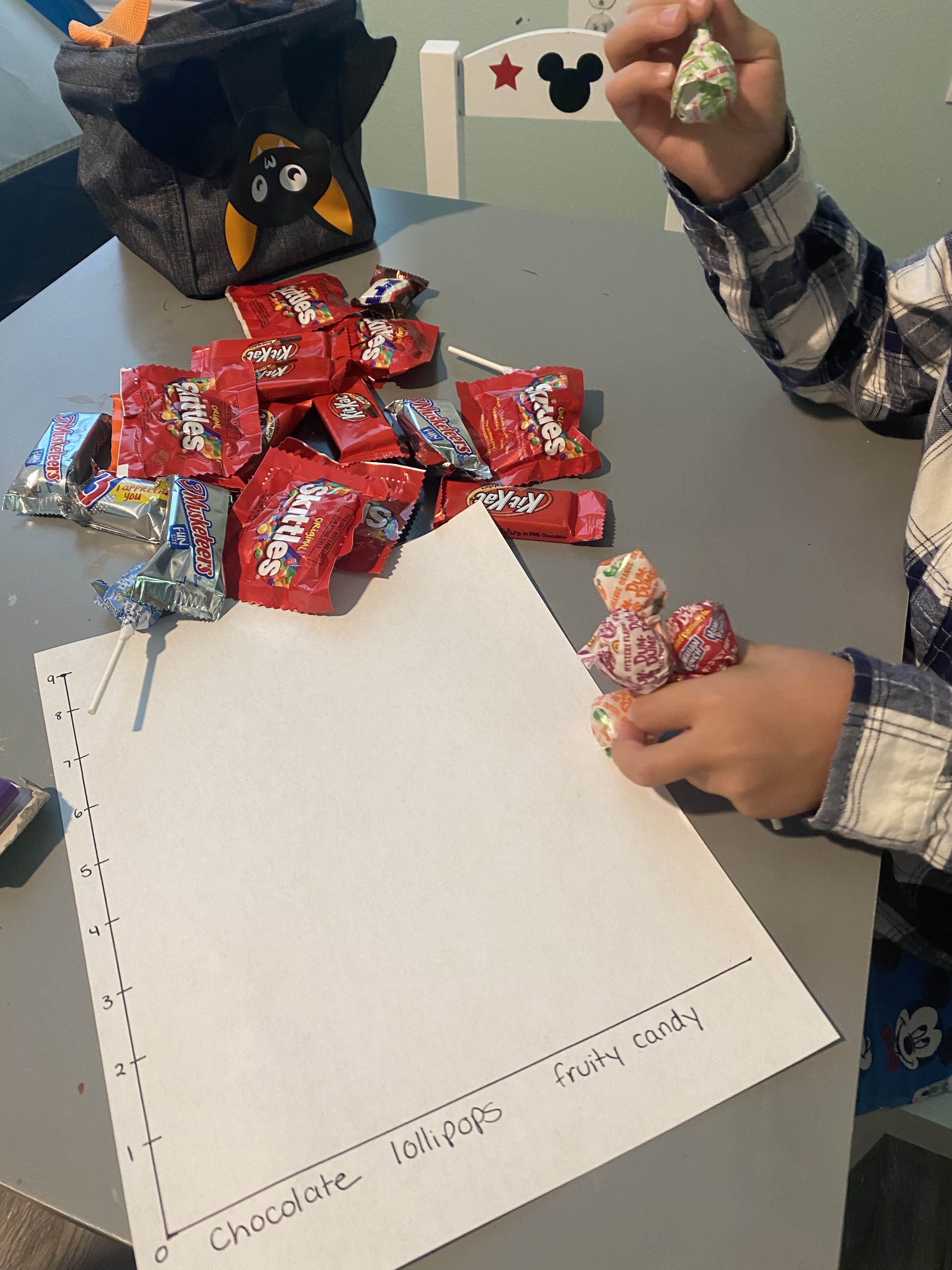-Candy graphing: I threw some candy in my little’s treat bag, then had him sort it into the categories: chocolate, fruity candy, and lollipops. Then he counted each group and found the matching number on the side of the graph. I drew a bar up to the number and he colored it in. When the graph was finished, I asked him questions like “Which candy did you get the most of (and least of)? How do you know?”