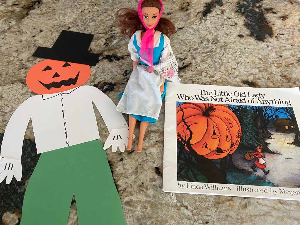 -“The Little Old Lady Who Wasn’t Afraid of Anything” object retelling: We read the story “The Little Old Lady Who Wasn’t Afraid of Anything” then had fun retelling the story together using cut outs of each part of the scarecrow and a Barbie for the old lady!