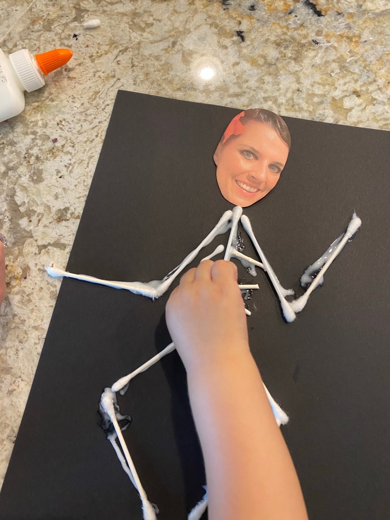 -Skeleton craft: Throw some glue on a piece of black paper so that it’s in the shape of a skeleton. If you want to throw in some science, you can use the scientific names for the bones…or just make it fun! Have your little stick q-tips on the glue to build their skeleton. Then use a cut out picture of their face for the head! I got this idea from Mrs. Plemon’s Kindergarten!