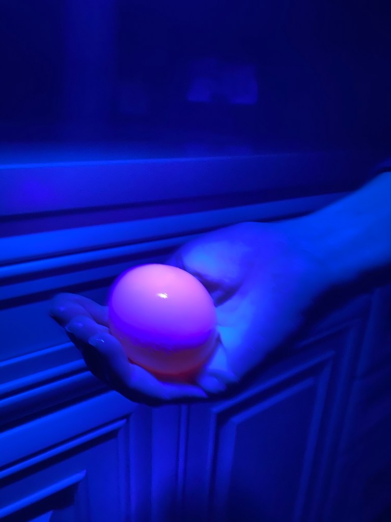 -Ghost eggs: Mix equal parts vinegar and tonic water in a large cup or jar (we did a cup of each, but it really depends on the size of your glass). Plunk in a few eggs and let them sit for a few days. Have your little make observations about what’s happening to the eggs as you wait. Then take them out, go into a dark room and shine a black light flashlight on them…they SHOULD glow! (Ours glowed PINK!) I got this spooktacular idea from Growing a Jeweled Rose.