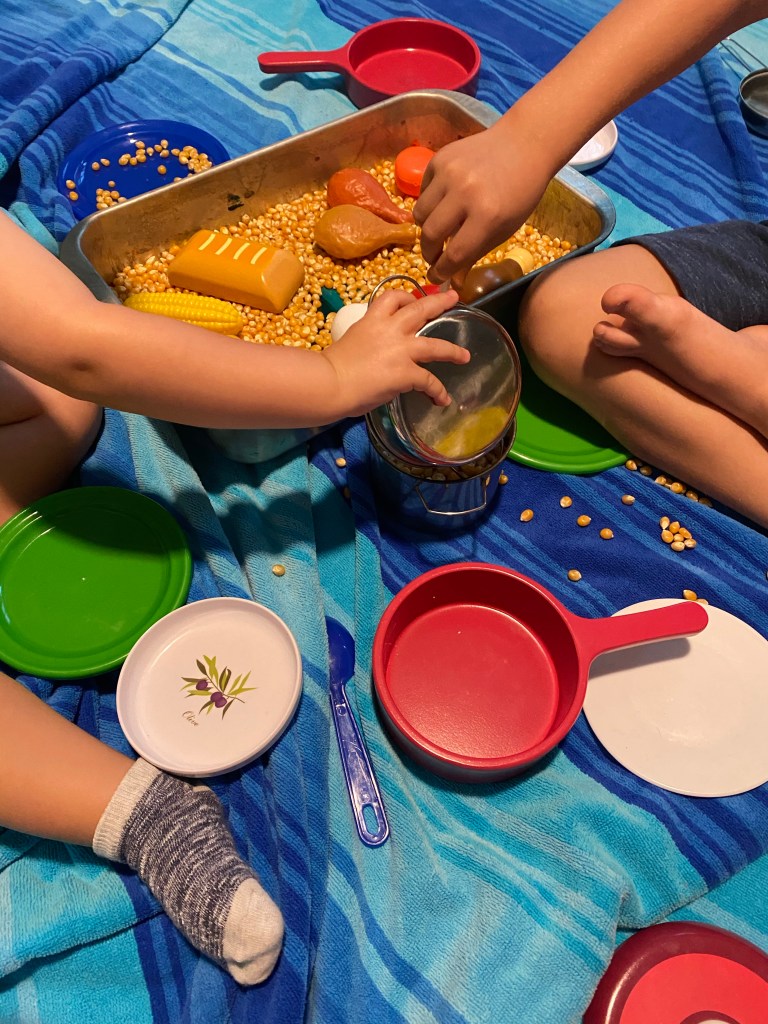 –Thanksgiving feast sensory play: My littles had such a blast with this one! You just pour a large jar of unpopped popcorn into a cake pan, add some Thanksgiving-ish play food and play pots, pans, spoons, bowls, etc. and let them explore!