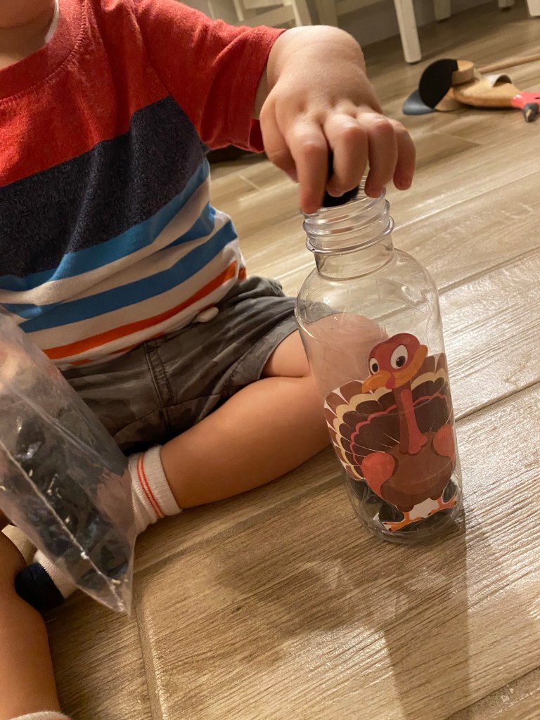 –Stuff the turkey fine motor practice: Print out a cartoon turkey and tape it to an empty water bottle. Then give your little pom poms to put in the bottle either with their hands, or with tongs (you can even count them as you go to practice their numbers!) I got this idea from Little Learning Club.
