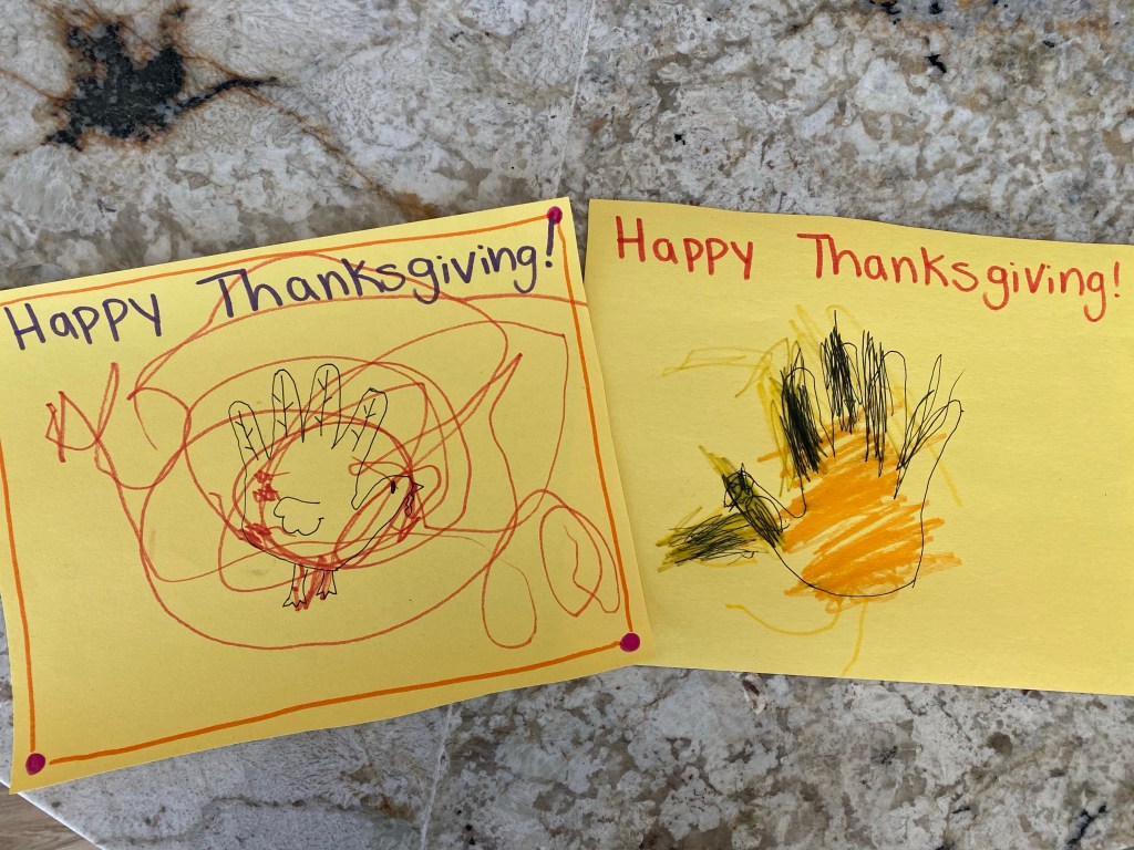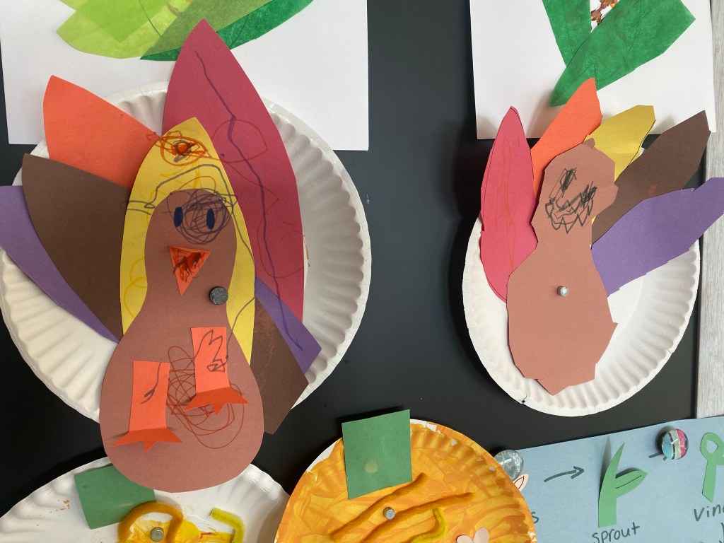–Paper plate turkey: Cut out construction paper feathers in purple, yellow, orange, red and brown. Cut out a turkey body in brown. Have your little glue the feathers to a paper plate, then glue the turkey body on top. Add legs, eyes and a beak. My little decided to also decorate his turkey with markers, which is totally fine! Let them be creative, right!? For my preschooler, I just drew the feathers and body on pieces of construction paper and had him cut them all out and glue them in place. He also drew his own turkey face on…with “scary teeth”…hahaha