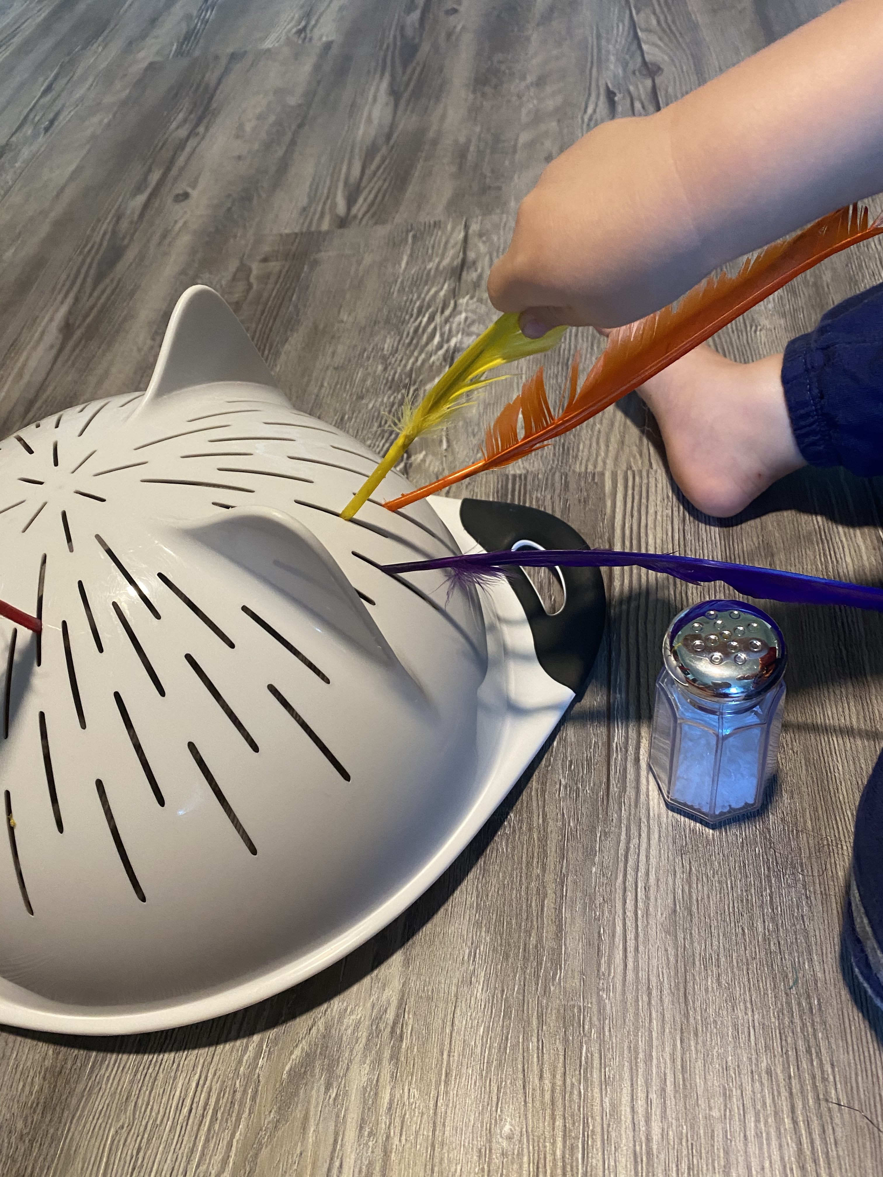 –Turkey feathers in a strainer fine motor practice: I gave my little a pile of colorful feathers and a strainer, then showed him how he could poke the feathers in the holes. It was a tad tricky for him since the holes weren’t round, but he and his brother ended up getting quite a few to stick! LoL Then they decided it would make a fun hat… hahaha