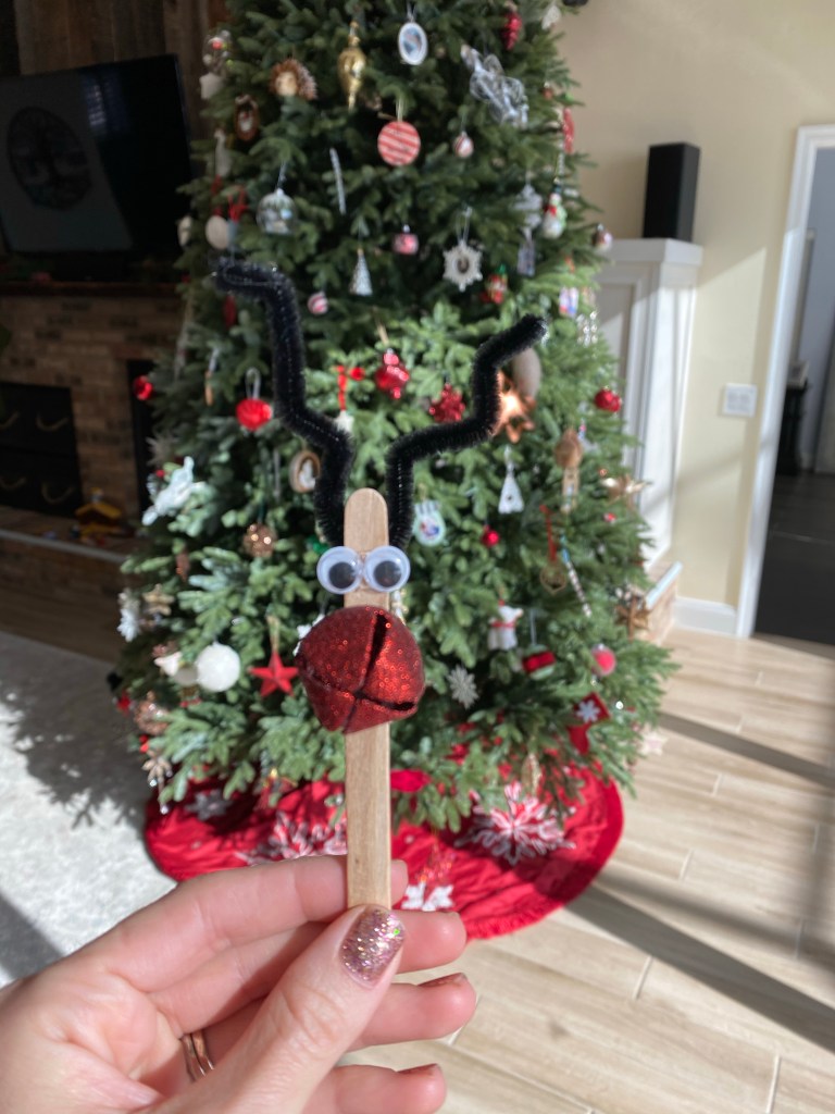 –Rudolph jingle bell shaker: Anyone remember “Stick Stickley” from Nickelodeon in the 90’s? These jingle bell shakers kinda reminded me of him, but my kids loved them! We used them each morning this week to accompany our songs during calendar time- and of course to help us sing “Rudolph”! I just hot glued some googly eyes and black pipe cleaner antlers to a popsicle stick, then tied on a bell with another piece of pipe cleaner by twisting it around the back of the stick then hot gluing it in place (including any sharp edges). Then I gave them to my littles to let them play! I got the idea from PreK Pages.