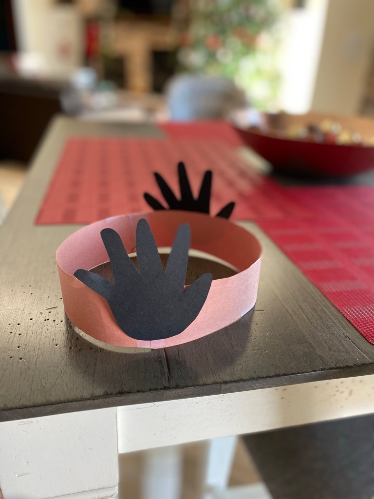 –Handprint antler hat: I traced my little’s hands with a white crayon on black paper then cut them out. I cut two strips of brown paper to make a headband (which he decorated while I was cutting out the handprints) then I taped them all together to make him a hat (which he refused to wear because he’s 2! hahaha)