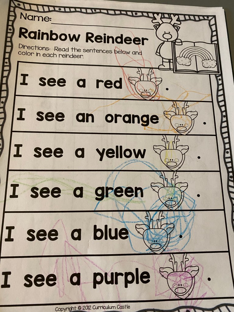 –Color worksheet: I don’t usually have my toddler do worksheets, however, he always wants to do one when his big brother is working on one (I usually end up just giving him a coloring page), and this one came with a free reindeer worksheet pack I got at Teachers Pay Teachers for my preschooler, so I printed it out to give it a shot! I read each sentence to him, then gave him the correct color and let him color the reindeers accordingly while repeating the color name for him as he worked (ie. “Oh that’s a good job coloring blue! What a nice blue reindeer!”)