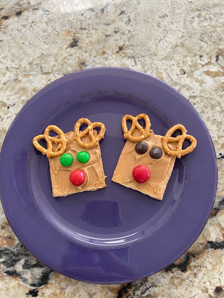 –Reindeer treats: When I saw this snack idea on Virtual Book Club for Kids I knew my littles would love it- and they did! You just use a peanut butter covered graham cracker, 2 mini pretzels and some M&Ms to make a little reindeer face for a snack! They were really yummy too!