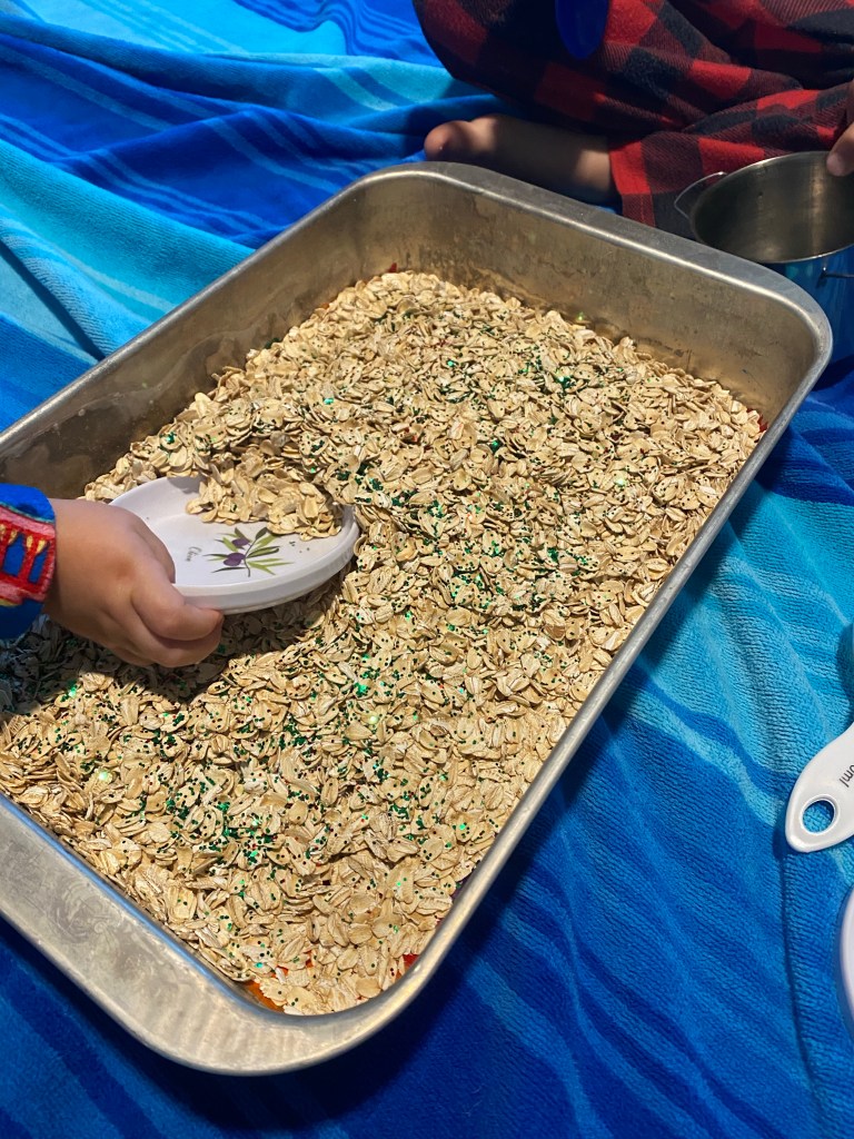 –Reindeer food sensory play: I dumped a carton of oatmeal and some glitter into our sensory cake pan, gave the boys scooping tools and let them play! They had a blast pretending they were making dinner for Rudolph and his pals!