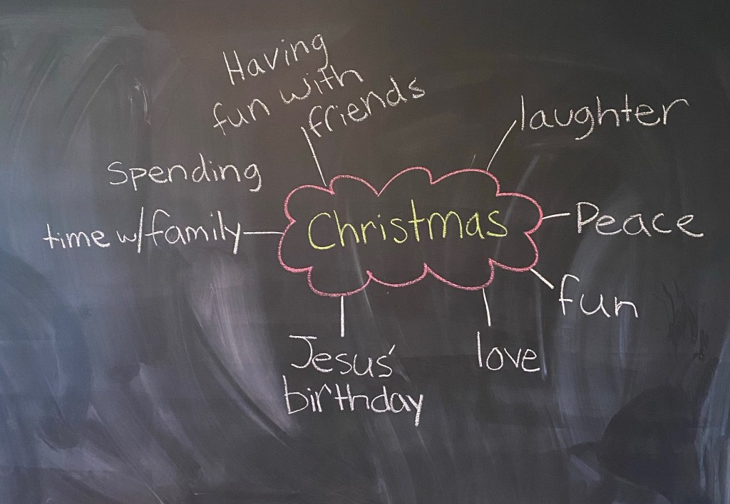 -The meaning of Christmas: Since the Grinch learns the true meaning of Christmas in the story (or at least secular Christmas), I thought my little and I would have a chat (and I would jot down) what Christmas means in our family. I wrote what he said on a web on our chalkboard with “Christmas” in the center.
