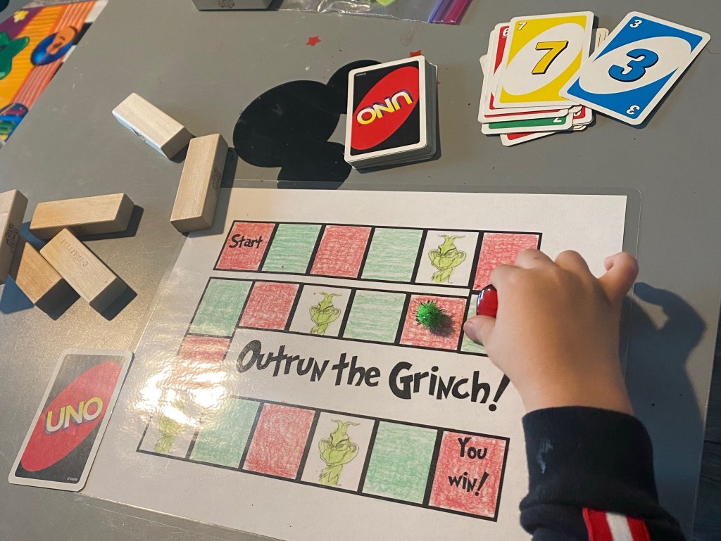 -Outrun the Grinch game: I got a cute “Outrun the Grinch” game board on Teachers Pay Teachers, printed it, colored it and laminated it. To play, my little and I took turns drawing an UNO card (you could also roll a dice), identifying the number, then moving that many spaces. If you land on a Grinch space, you lose your turn. It was really fun! We played 3 times at my little’s request!