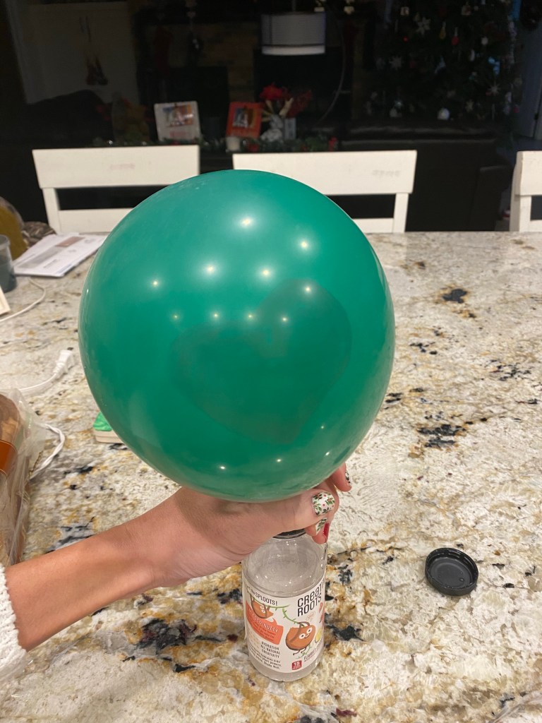 -Grow the Grinch’s heart: This was a fun science experiment I got from Inspiration Laboratories and Creative Family Fun. First, blow up a green balloon just a smidge so it’s firm enough to draw a heart on it with red sharpie. Then fill it with about a tablespoon or two of baking soda using a funnel (I just made one from paper). Next, pour some white vinegar in an empty water bottle and fit the balloon around the top. Hold it securely while you dump the baking soda into the vinegar by giving the balloon a good shake, then watch the Grinch’s heart grow as the balloon fills up with gas produced by the fizzy chemical reaction!