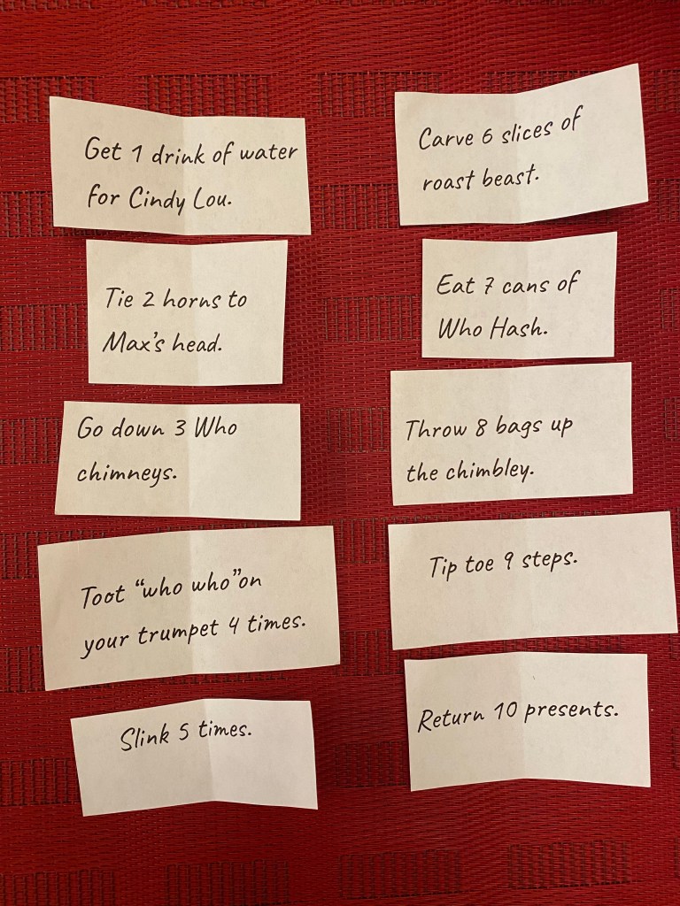 -Grinch counting game: This was a HUGE hit with both my littles and they begged to do it again when we had finished all the cards! You just print, cut out and fold up all the cards and tuck them in a bowl, have them draw a card one at a time, then act out the card while counting (ie. Slink 5 times.) Here’s a link to the game cards you can print for free!