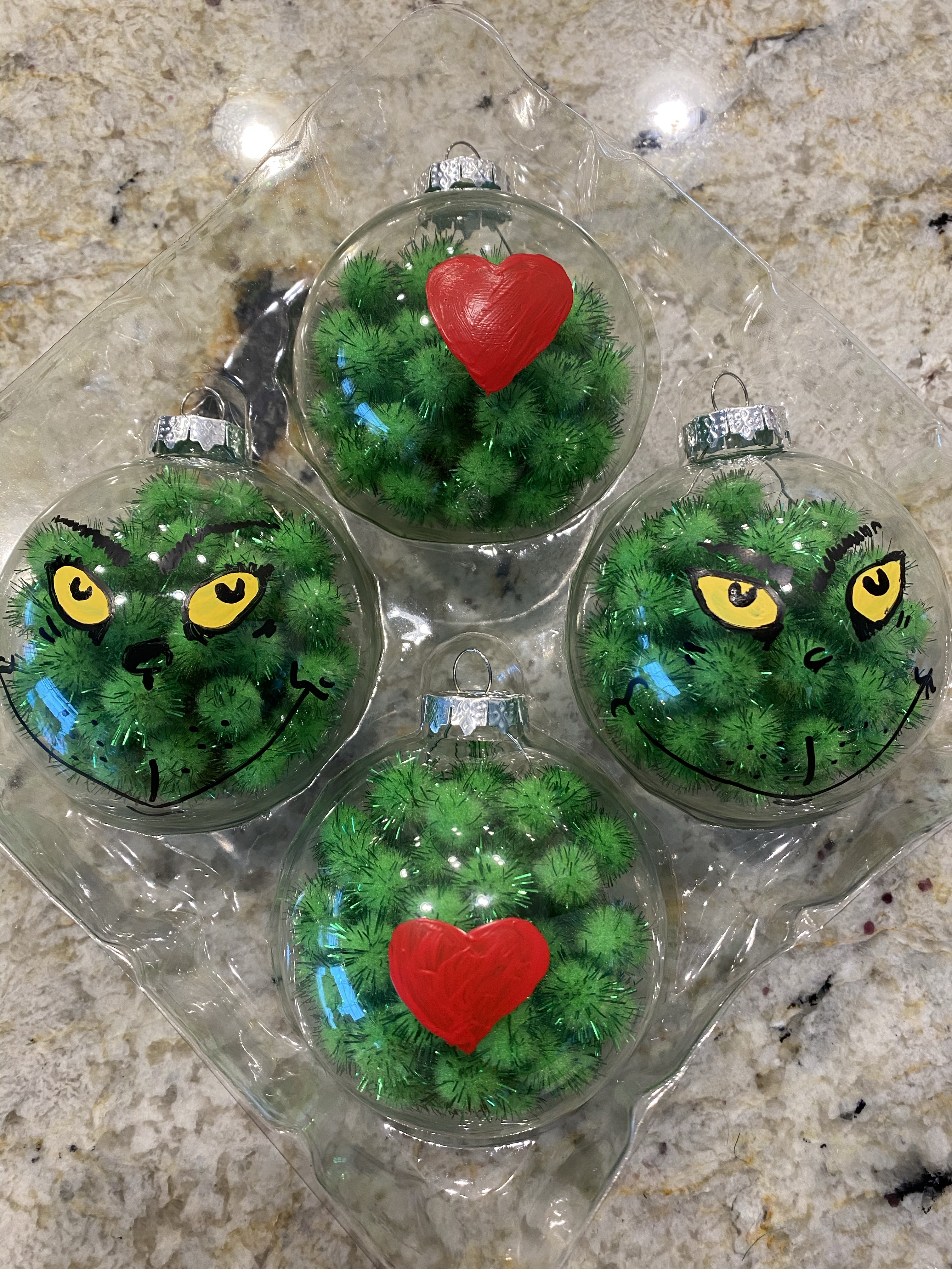 –Grinch ornament craft: These came out SO cute and were seriously easy to make- plus they make great hand made gifts for family and friends! First, I got a set of 4 clear glass balls for about $2 at Walmart, then I painted hearts on two of them and Grinch faces on the other two (if you’re not the best at painting, you can just do hearts on all of them, but if you get a black paint pen it’s super easy to do his face! Maybe just practice on paper a few times first!) Then I carefully took the stopper off the top of the ornaments and gave my littles some small glittery green pom poms to pop in the top until they were full (hello- great fine motor practice!) Then I just put the stoppers back on and tied some string to them for hanging! (if you want to be extra Grinchy, you can even write “2020: Stink, Stank, Stunk” on the back with a paint pen! hahaha) I got this idea from Buggy and Buddy. (And yes, my little boy has red painted nails… I was doing mine and he wanted his painted too so I figured why not?! Colors are fun!)