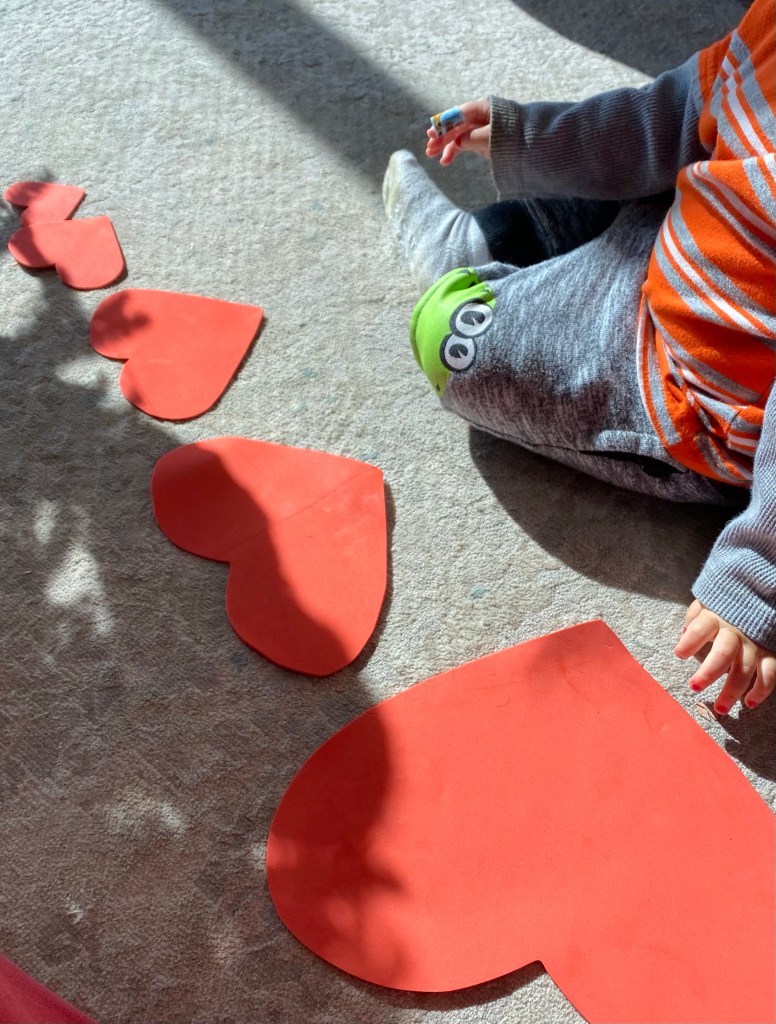 –Grinchy beginning math: I cut out 5 different sized hearts from a large piece of red craft foam then showed them to my little. I asked him if he could find the smallest heart, and when he did I asked him to place it to the side. Then we continued with the next smallest and so on, until he had ordered all the hearts from smallest to largest! Then I asked him to count the hearts and helped him when he made mistakes (he still skips 3 and now 4! LoL I think 5 is his favorite and he just can’t wait to get there!)