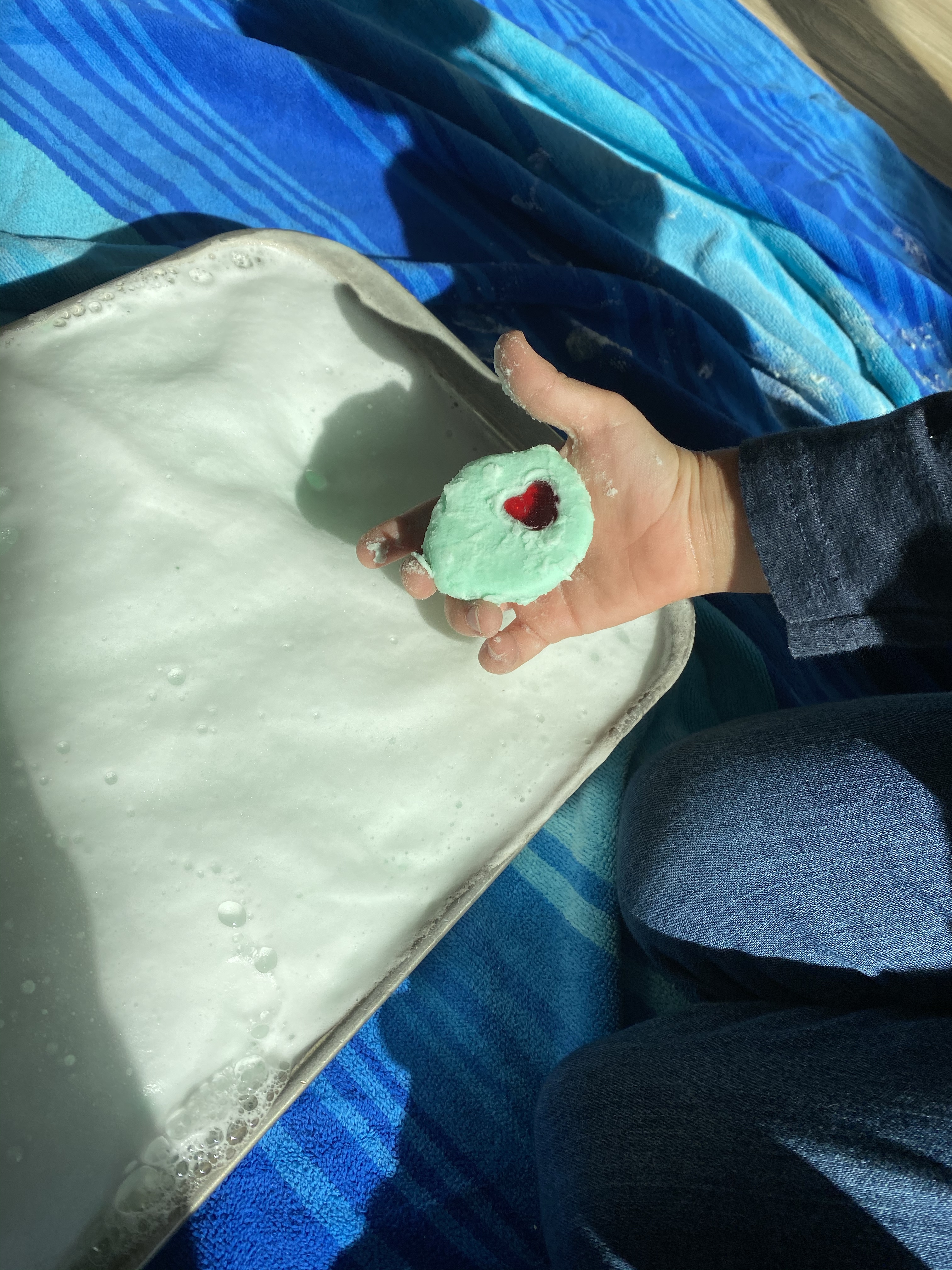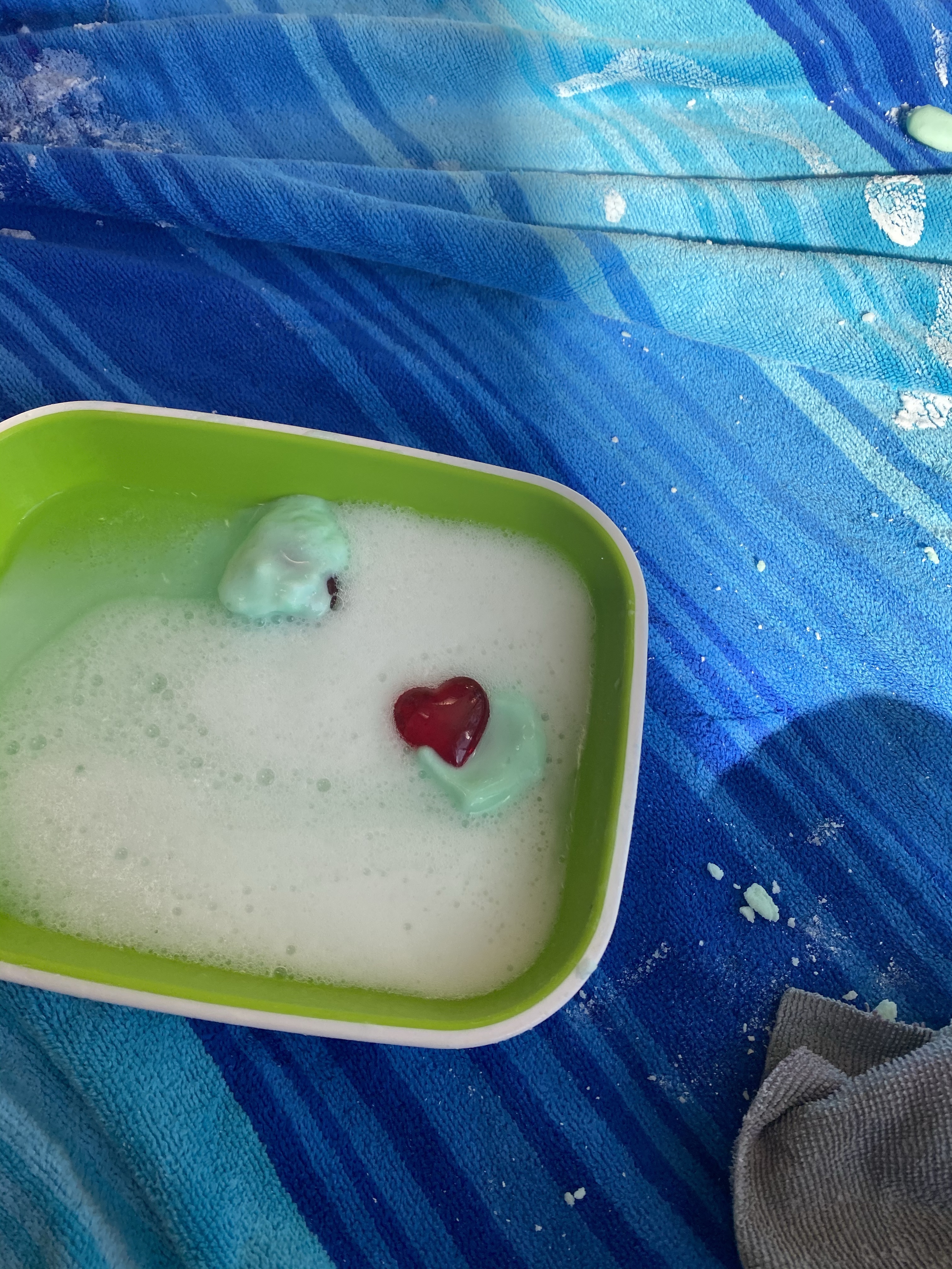 –Fizzy Grinch hearts: My littles both LOVED this fun science exploration/sensory play activity and carried the tiny hearts around all day afterwards! (I ended up getting a ton of hearts, but I’ll find something fun to do with the rest on Valentine’s Day!) So for the experiment you make “dissolving rocks” by mixing baking soda and water dyed green with food coloring until you get a moldable paste. Then, hide a heart gem inside a small ball of the paste, place them on a plate and put them in the freezer (I made 6 using a cup of baking soda and about 1/4 cup of water, but you can do as many as you like!) When they’re completely frozen, mix a squirt of dish soap with 1/2 cup of white vinegar in a cake pan, then have your littles put the “dissolving rocks” in the vinegar for fizzy, foamy fun! If the dissolving slows down, just pour more vinegar on top of the “rocks”. You can also do this with just vinegar (no soap) but you won’t get the cold foam to play in (we did 4 in foam, 2 in plain vinegar and they were all cool- but the boys loved playing in the foam as the rocks dissolved). I got this idea from Inspiration Laboratories and Reading Confetti. Pro tip- put down a towel or blanket under your pan…this WILL get messy and that makes for a much easier clean up