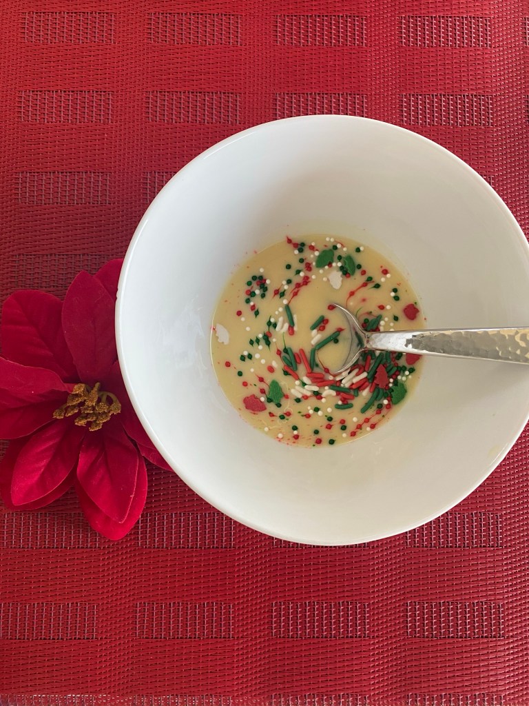 –Who pudding: To make this treat we mixed up a packet of instant Jello pudding (cheesecake flavor is the yummiest!) and added Christmassy sprinkles! Easy peasey and SO Who-licious!
