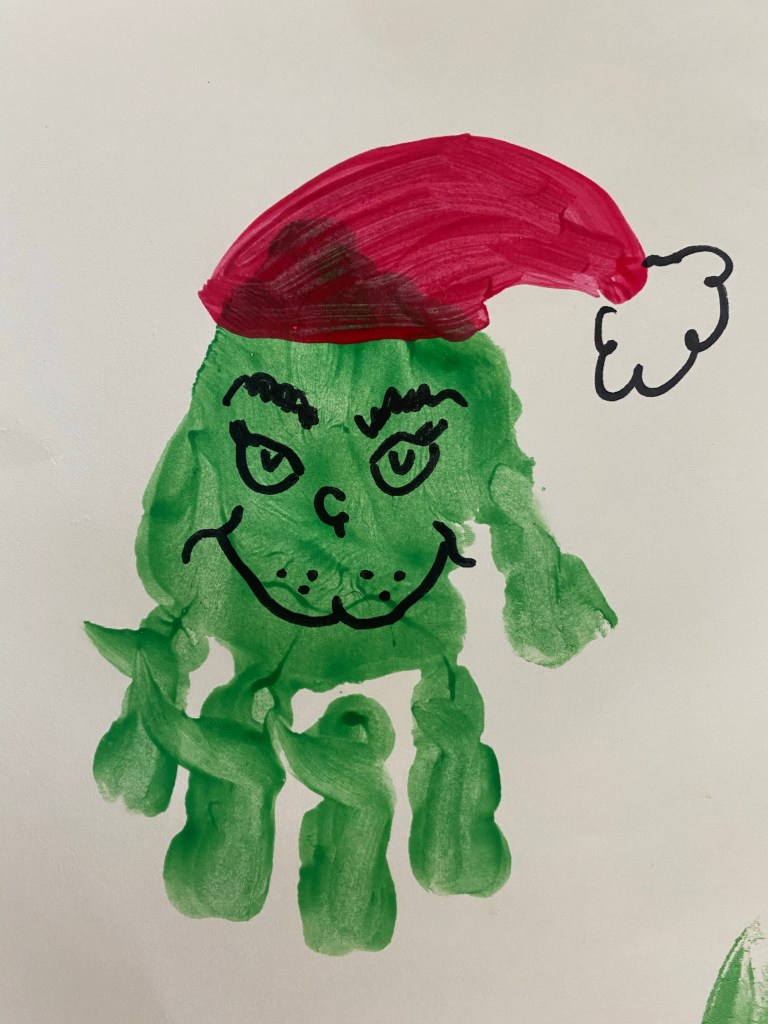 –Grinchy handprints: I painted my little’s hands green then had them make handprints on a piece of card stock. Then I added a Santa hat and Grinch face and voila- the meanest handprints this side of Whoville!