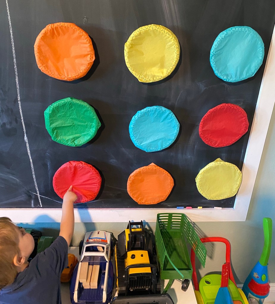 -“8 Little Planets” and punch-a-bunch questions: We read the story “8 Little Planets” then I printed these comprehension questions based on the book, placed them in paper bowls, and covered them with tissue paper to make “punch-a-bunches”. I hung them on the wall with packing tape, then had my littles take turns punching them open and getting out each question. Then my preschooler answered the questions based on the book.
