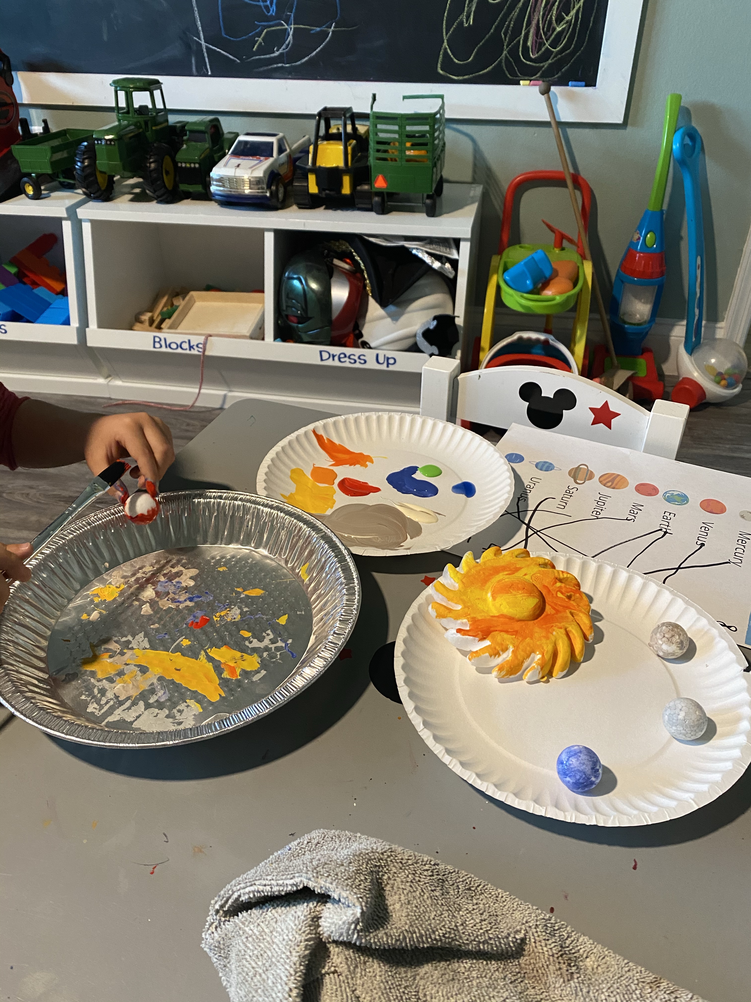 I don’t know anyone (especially kids) who isn’t fascinated by space. I mean is there anything more humbling than to look up at the vast spread of the heavens God created- all whirling stars and planets- and to ponder just how small we are? I can’t think of anything, especially when you get into the details of it… I mean technically things in space are so far away you’re looking back in time when you view the night sky because it takes the light so long to travel to our eyes- even the closest star, Proixma Centauri (most searches will say it’s Alpha Centauri, but that’s actually a star system. Proxima Centauri is the dimmest of the 3 stars it contains and is the closest to our Sun…which by the way is also a star), is over 4 light years away, meaning the light we see from it is technically from 4 years ago! Fun fact: many star systems are actually binary (as opposed to our Sun, which is singular), which means when the suns set on Tatooine in Star Wars, they’re actually being scientifically accurate (although it is harder for planets to form around binary star systems compared to singular ones)! Like I said, space is just so fascinating! My little has been interested in space for a year or two, so I knew this was a learning topic we had to explore! Don’t forget to zoom on over to my toddler post “3, 2, 1 BLAST OFF!” for more fun space themed ideas, like “moon dust” sensory play and DIY moon rocks.