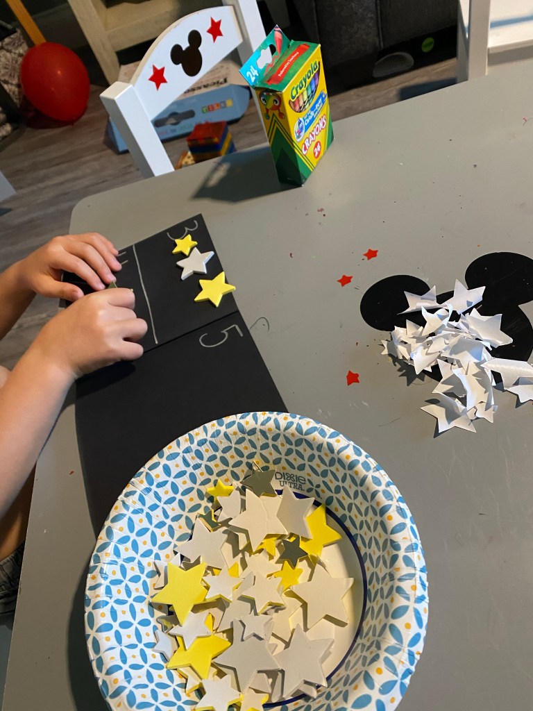 -Star sticker counting book: I stapled together some black sheets of paper to make mini-books, then wrote the numbers 1-10 with one number on each page. Then I had my little identify each number and stick star stickers on each page to match the number.