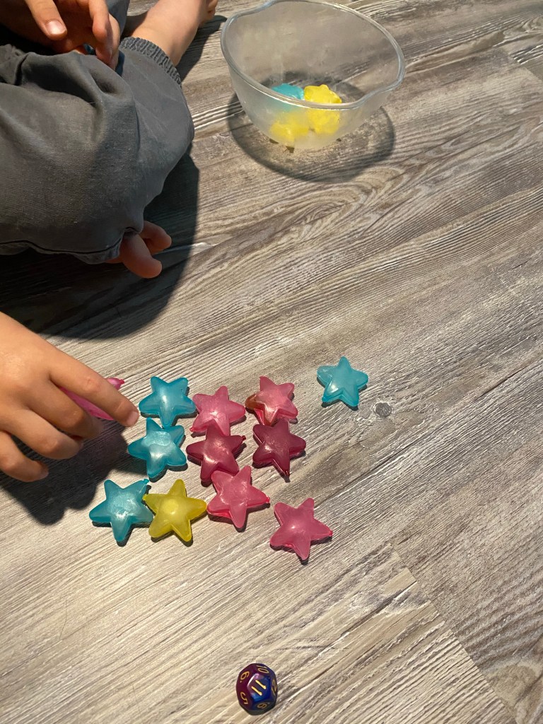 -Star ice cube roll and count: I had my little roll a 12 sided dice (10 sided would work too!), then count out that amount of star reusable ice cubes we had on hand. Star cut outs, star beads or foam stars would work great too! We took turns to make it more fun and game-like!