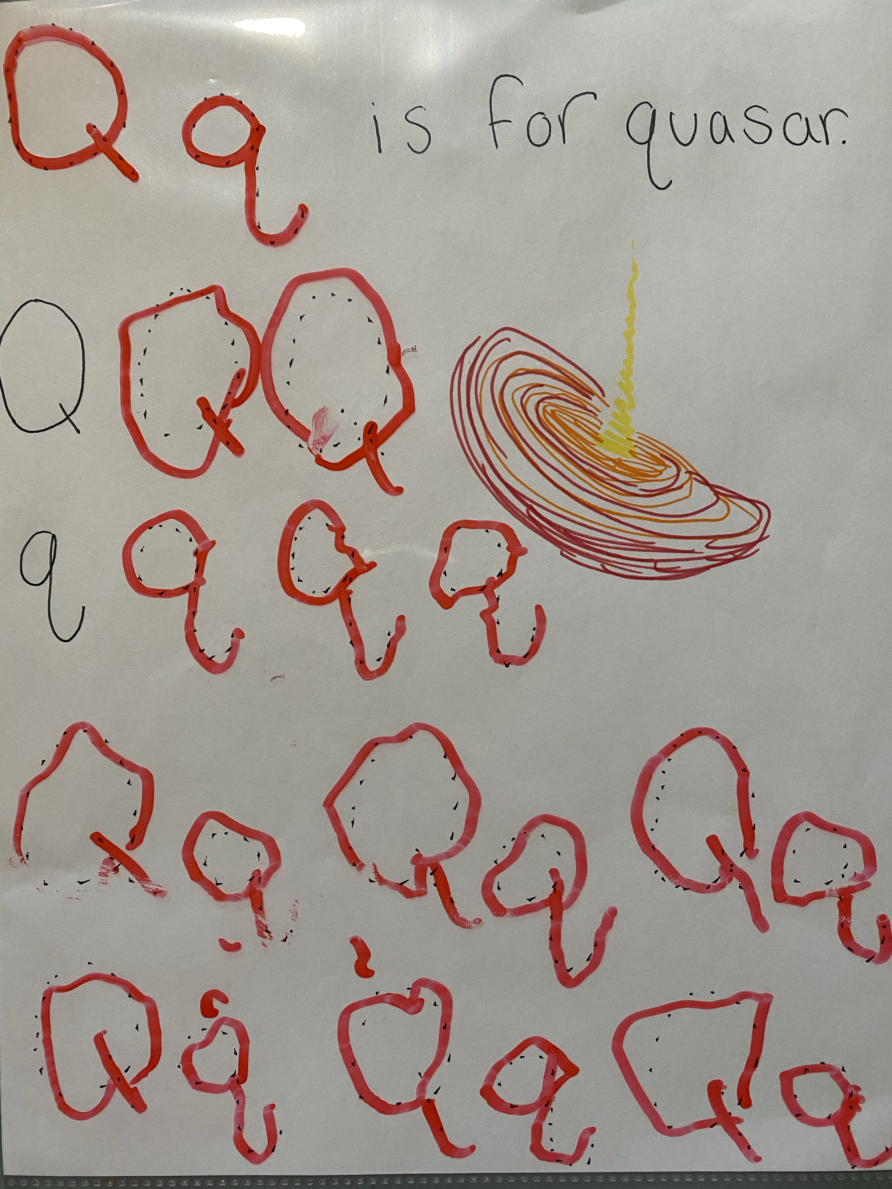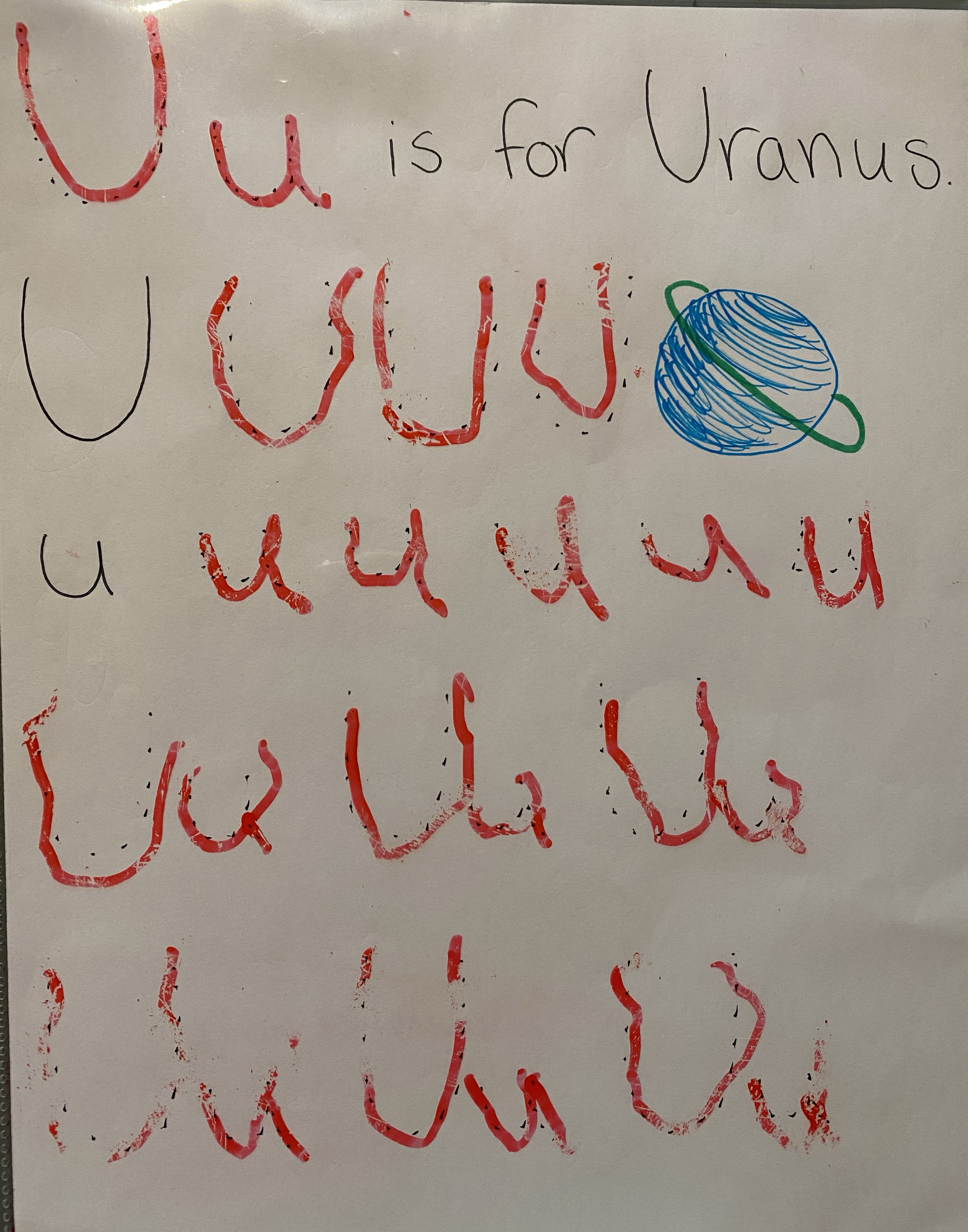 -Q is for quasar, U is for Uranus: I made some handwriting practice pages for the letters Q and U by writing the numbers with dots, tucking them in page protectors, and having my little practice writing the letters with a dry erase marker. (Pardon the picture of the U page- I forgot to take a picture and he had already completed the Q page on the other side so it got partially erased in the process! LoL)
