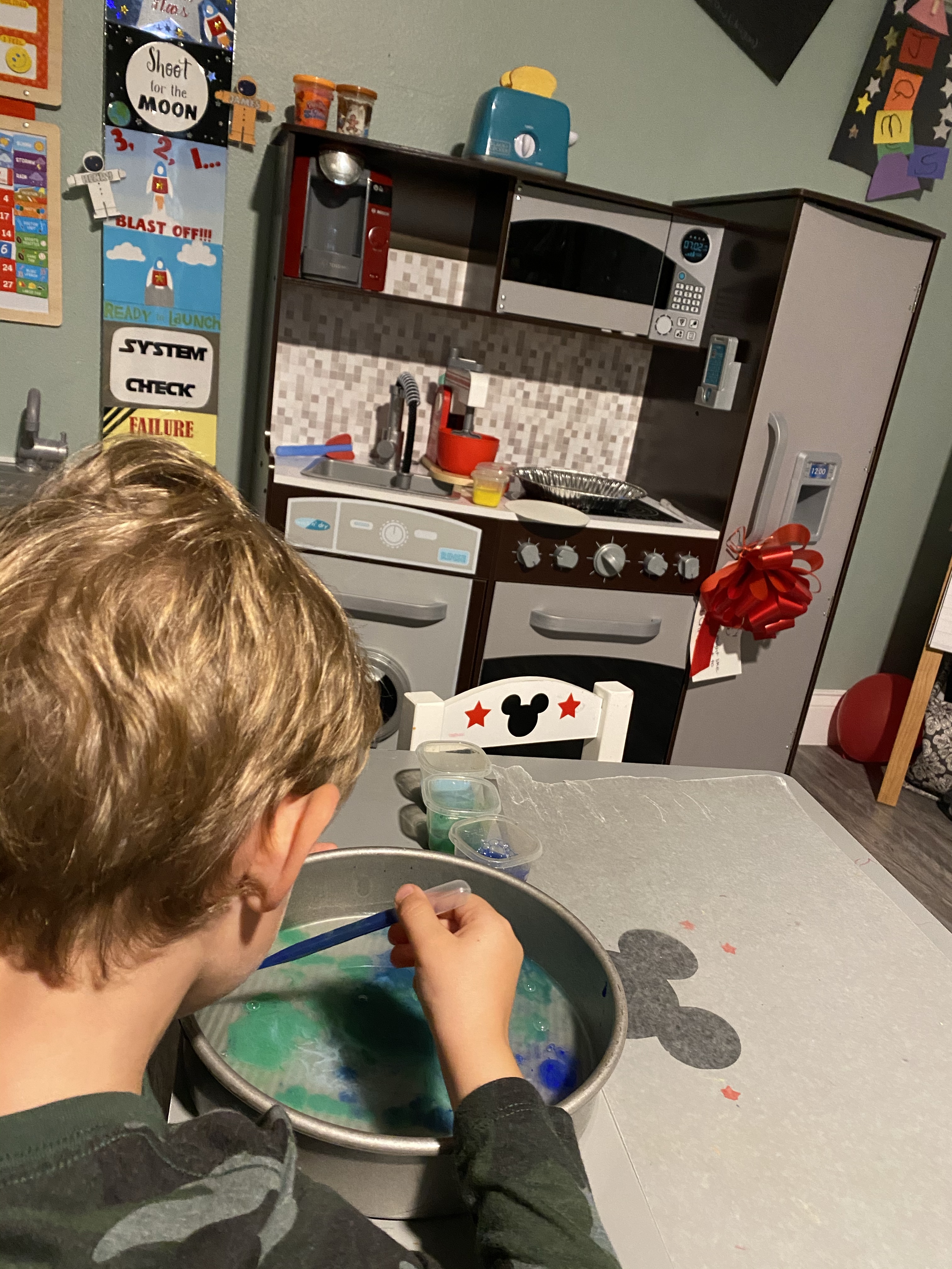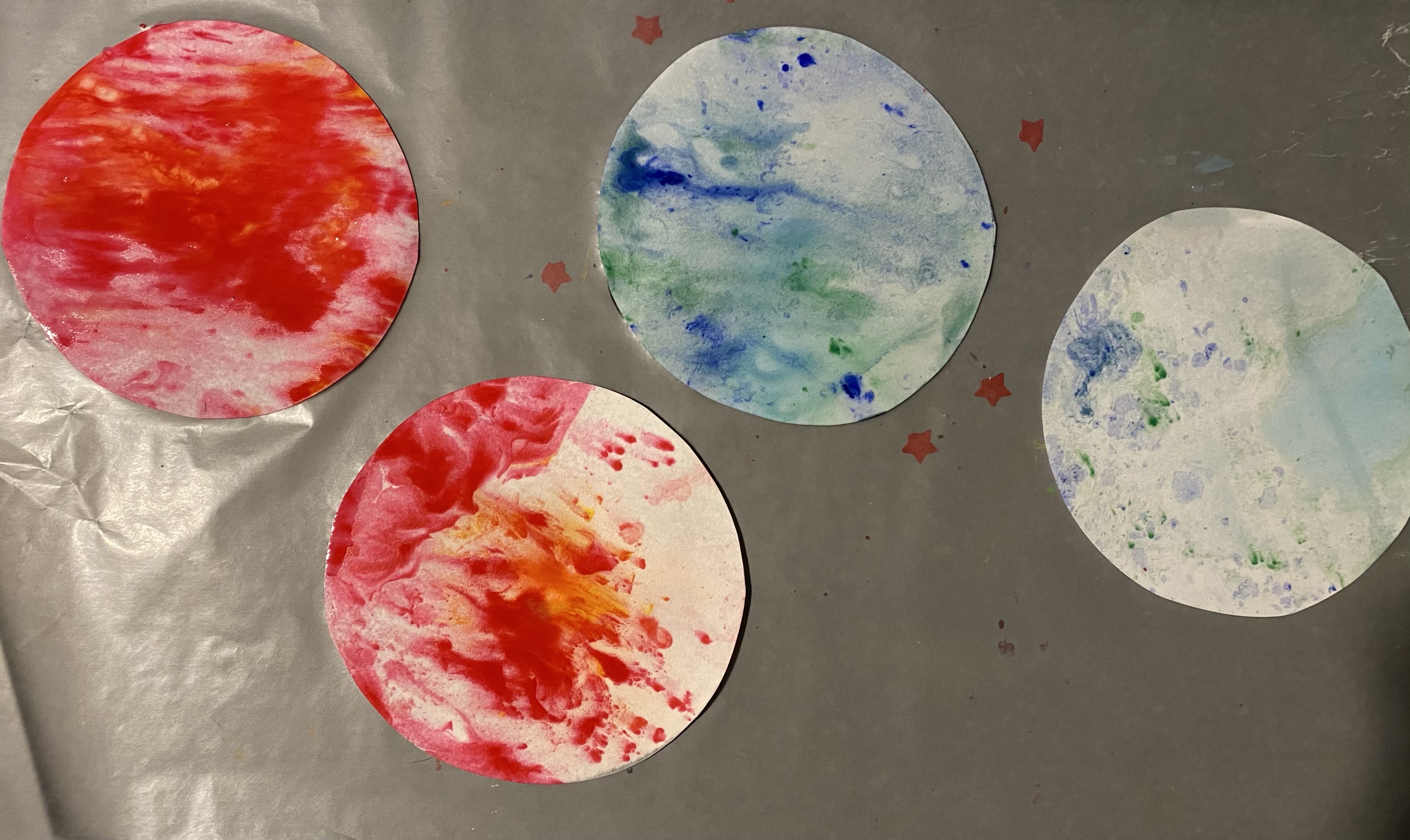 -Marbled planets: This process art was a lot of fun (and less messy than I thought it would be, so don’t be scared! LoL) So you take liquid starch and just cover the bottom of a pie pan with it (I just made my own by boiling 3 3/4 cups of water, mixing 2 tablespoons of cornstarch with 1/4 cup of water, adding it to the boiling water then letting it cool- thank you 30 Seconds for saving our project because I totally forgot to buy liquid starch!) Then, mix about 2 tablespoons of paint with a tablespoon of water (to make it easier to pick up with a pipette/dropper)- I did different colors in small baby food containers we had on hand. Then, let your little drop and swirl the paint into the pie pan to their heart’s content. When they’re done exploring (that part alone was actually pretty cool!), carefully place a cut out circle of cardstock in the pan for 30 seconds. Then gently remove it and place it on a sheet of wax paper to dry. We experimented with letting our circles float on top of the starch and pushing them to the bottom and both methods came out cool! I got this idea from Everyday Chaos and Calm.
