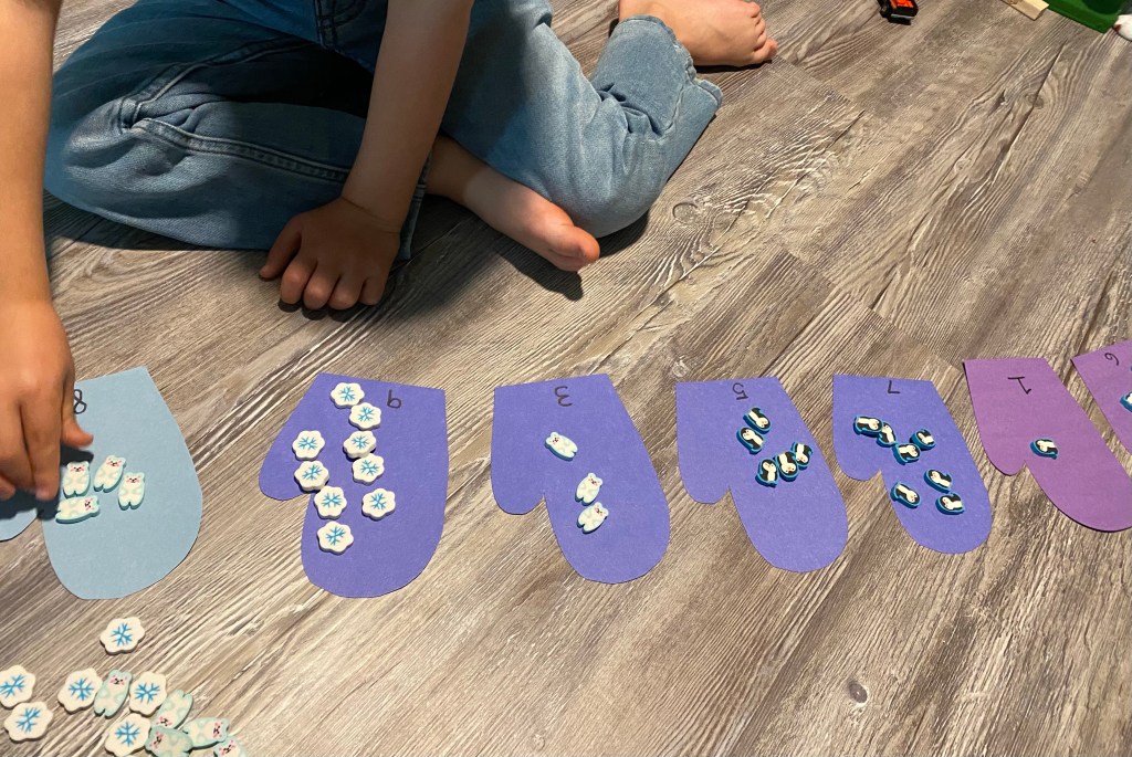 -Winter eraser count: I got a set of wintery erasers (snowflakes, penguins, and polar bears) from Target’s dollar spot, then had my little count how many were in the set.