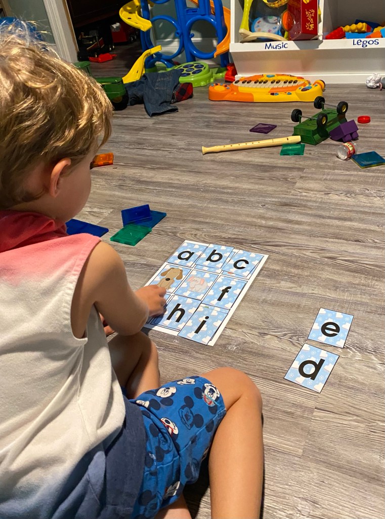 -Mitten letter match: I printed and laminated a set of letter match mittens from Teachers Pay Teachers then split them into 3 groups so my little wasn’t looking at 58 letters all at once- that would be a bit overwhelming! Then I had him match the uppercase to the lowercase letters and identify the letter’s name when he found its match.