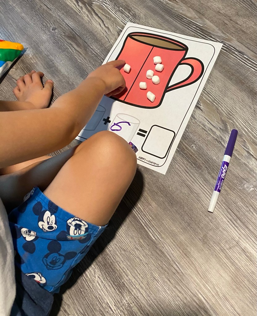 -Hot cocoa adding: I printed this cute hot cocoa adding page from Teachers Pay Teachers and laminated it to make it dry erase (you could also tuck it in a page protector if you don’t have a laminator!) Then I had my little roll a dice to get each of the numbers for the addition sentence. He wrote each number down in the boxes, then showed it with mini marshmallows on each side of the mug, then counted all the marshmallows together to get his answer.