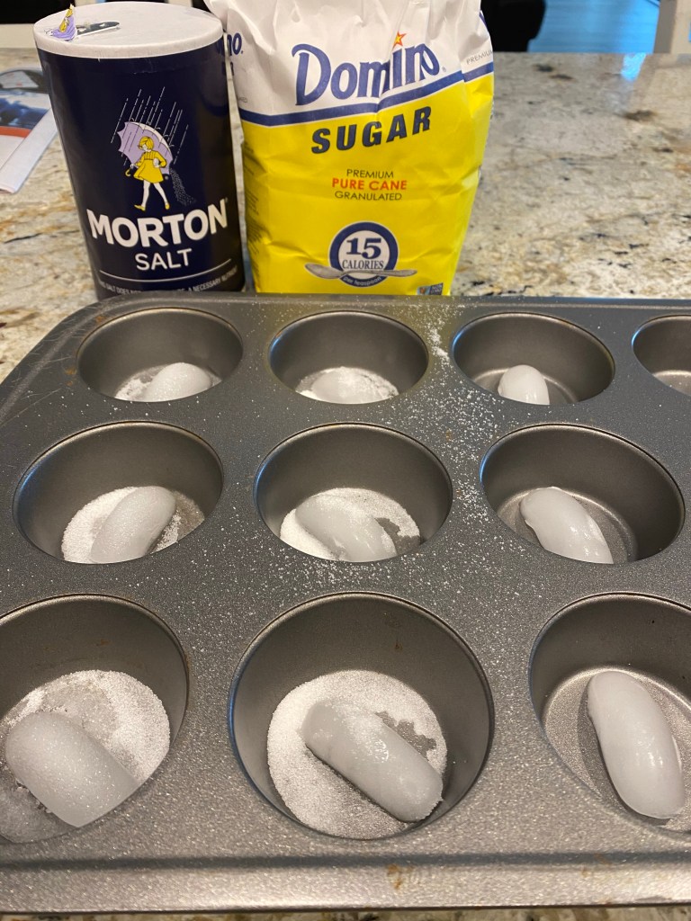 -Sugar, salt and nothing ice melting experiment: Our inquiry question for this experiment was “What are the effects of sugar and salt on ice compared to plain ice?” (a good inquiry question is never a “yes” or “no” or one word answer). I asked my little what he thought might happen if we put sugar, salt and nothing on ice cubes. Then we set up our experiment by placing ice cubes in each section of a muffin tin (so they wouldn’t float around as they melted). We added a teaspoon of salt to each of the first 3 tins, a teaspoon of sugar to the next 3 and left the ice cubes plain in the last 3. Then we observed and discussed what was happening. The sugar and the salt both made the ice melt quicker (which totally surprised me- I knew about salt…but sugar? Super cool!) but the salt appeared to “eat away” at the top of the ice, whereas the sugar just sped up the melting process.