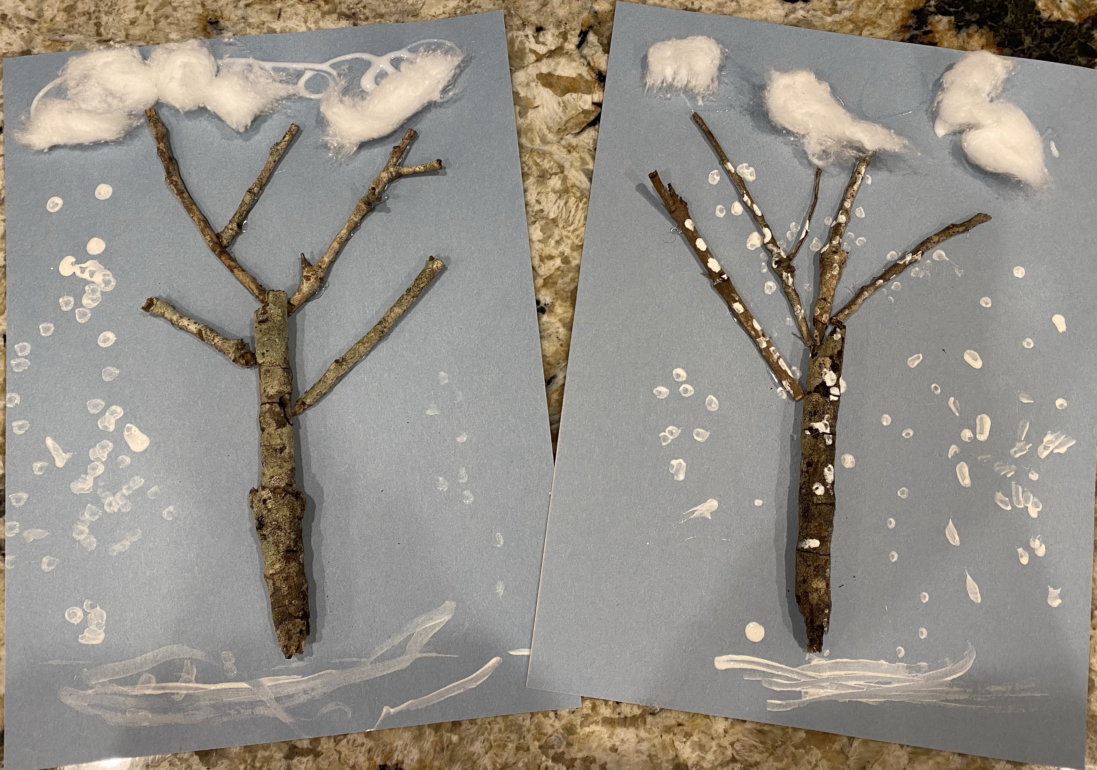 -Winter trees: We discussed how some plants, including many trees, go dormant in the winter. This means their leaves fall off and the tree doesn’t grow much- kind of like animals who are hibernating. Then we collected some sticks and I hot glued them to a piece of construction paper to make a leafless winter tree. Next, I asked my little where trees grow from- the ground! So he painted a snowy ground under his tree. Then I asked what happens in winter- it snows! He used a Q-tip to paint snow all around and on his tree. Then I asked where snow comes from- the clouds! So he added some cotton ball fluff for clouds at the top of his page. I got this idea from Fantastic Fun and Learning.