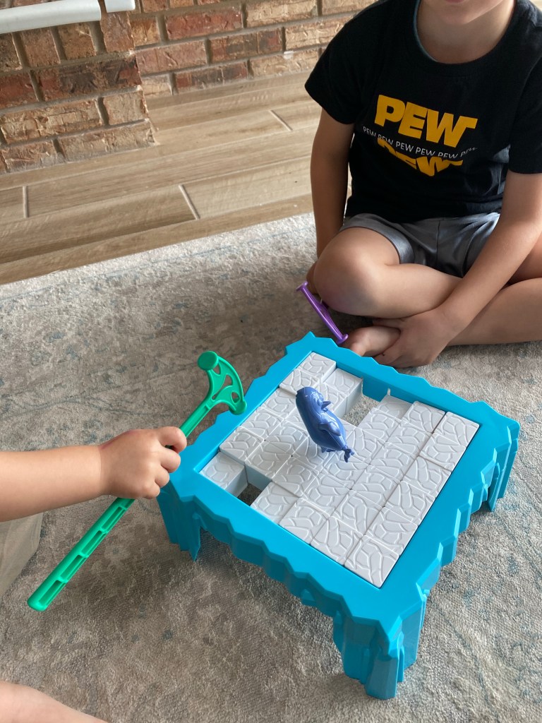 –Don’t Break the Ice: This game is so much fun, and is great fine motor practice, even if your little isn’t old enough to understand the rules yet! They will love hammering out the ice cubes over and over again! If you have an older toddler it’s a perfect beginner game because it’s simple and teaches taking turns. You just place all the “ice cubes” in the table, then have your little hammer them out. If they are older, they can take turns hammering one out with you (or a sibling). Whoever knocks the penguin down loses.