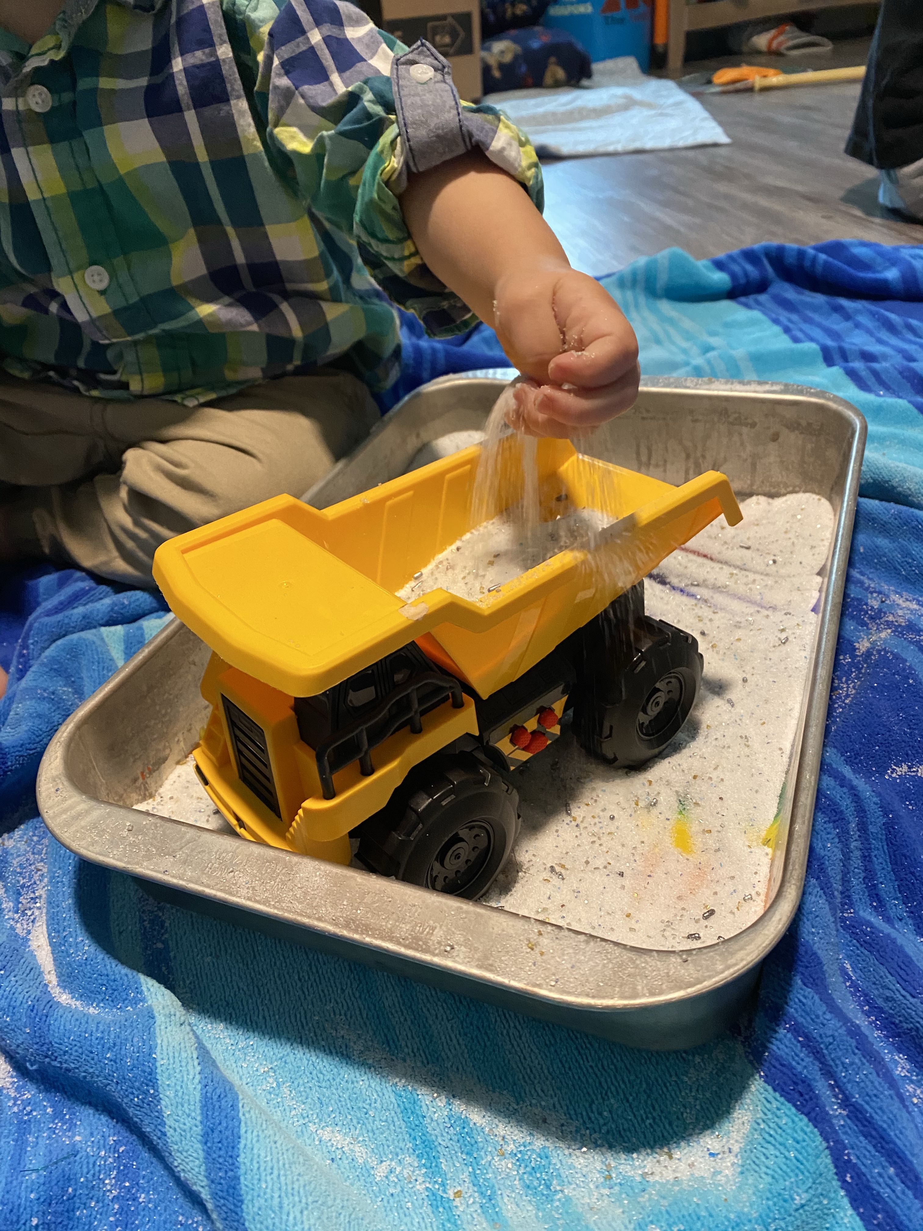 –Play snow idea #2: For this play snow, I just mixed some silver, gold and blue sprinkles with a bunch of sugar in a cake pan (in fact, if you’ve been following me for awhile, this is the same recipe I used for “Pixie Dust” back during Disney week if you saved it!) Then the littles got out their snow plow and dump truck toys and had a blast plowing and moving the snow around. (To contain the mess a bit, place a large towel or blanket under the pan- luckily it also vacuums up super easy!)