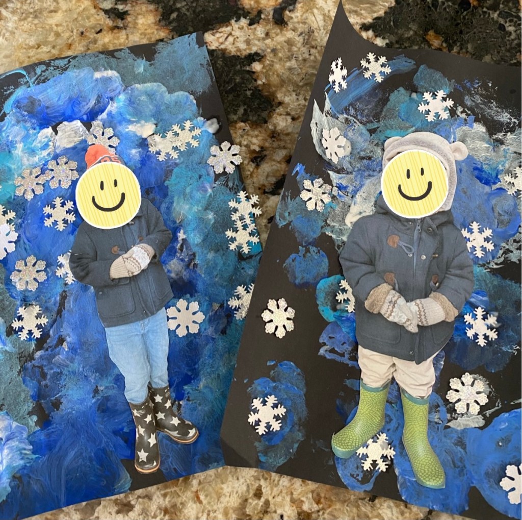 –Winter cotton ball painting: I saw this wintery cotton ball painting idea on Fantastic Fun and Learning and knew we had to give it a try! You just have your little paint a black (or dark blue) sheet of paper by bouncing a cotton ball clipped to a clothes pin up and down in paint, then on the page (we used white, dark blue and light blue paint). Then, take their picture all bundled up in their outdoor winter clothes, print it, cut it out and have them glue it to the center of the page. Use snowflake confetti or stickers to decorate the page as a final touch.