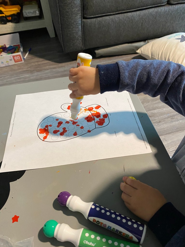 –Do-a-dot mitten painting: I printed a few mitten do-a-dot pages and let my littles decorate their mittens with dot markers. This is great hand-eye coordination practice for toddlers…if you can get them to actually stamp the dots! LoL