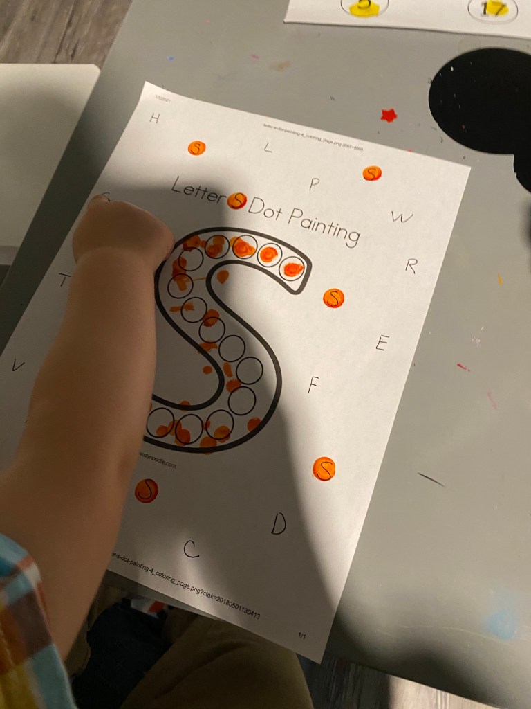 –S is for snow: My little has been interested in letters for awhile now, so I thought it would be fun to start introducing some of them to him. Toddlers don’t have the fine motor skills to write yet, but they can start forming letters using dot markers and stickers. I printed a letter S do-a-dot page, then I had him dot the letter S. Next, I wrote various letters all around the S and asked him to find the S’s, which I then dotted for him (eventually, I’ll let him dot them, but he was being silly and I didn’t want dots all over the page!)