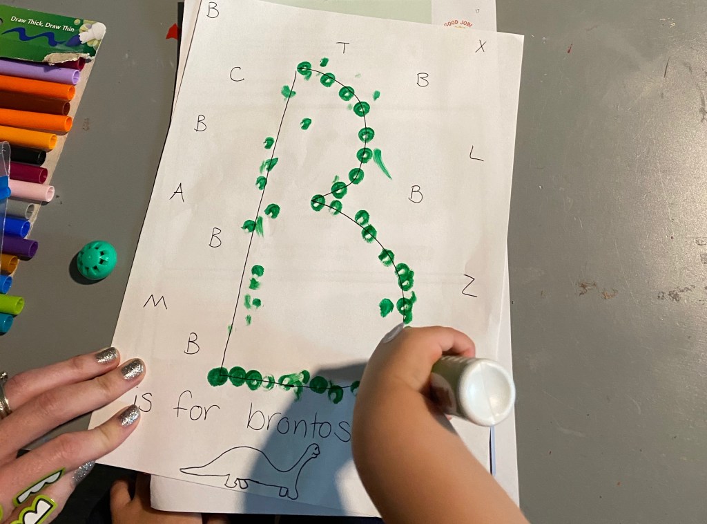 –D is for dinosaur: I made a B is for Brontosaurus letter recognition practice page (before reading that the Brontosaurus was actually an Apatosaurus…scientists THOUGHT they had discovered a new dinosaur, named it, then discovered years later it was actually the exact same creature that had already been discovered and named Apatosaurus years before! Who knew!?) Anyway, I chose to do letter B just because my little already knows D so he doesn’t really need to practice it- but you can make your page on whatever letter or dino you like! To do the page, I showed my little how to dot the lines of the B with a do-a-dot marker to make the letter, which was great fine motor practice. I also included a letter hunt all around the B and had him point to and dot the Bs on the page.