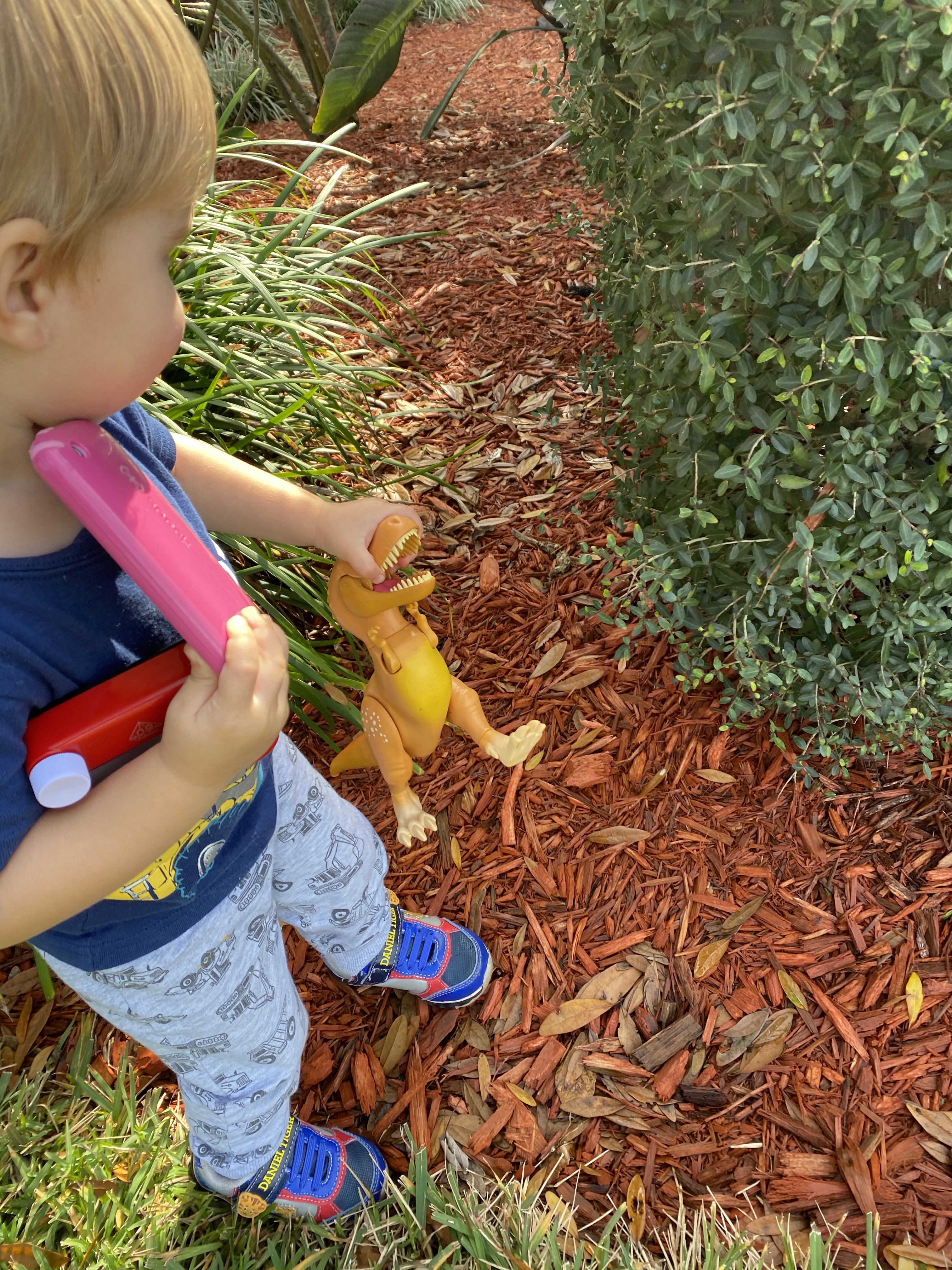 –Dinosaur hunt: My littles love hunting for anything, so I knew this would be a hit! I just hid a bunch of our dinosaur figurines around the yard then had them go looking for them. To throw in a little math, we lined them up in the driveway and counted them when we were finished! If your dinosaurs are on the smaller side you can also put them in Easter eggs (aka dino eggs) and have your littles open them when they find them, which is fun too! They carry big and little dinosaur figurines for $1 at Dollar Tree!